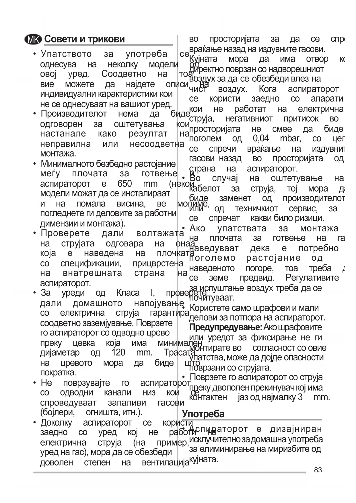 - Доколку аспираторот се користи заедно со уред кој не работи на електрична струја (на пример, уреднагас),морадасеобезбеди доволен степен на вентилација во просторијата за да се спречи враќањеназаднаиздувнитегасови. Кујната мора да има отвор кој е директноповрзансонадворешниот воздухзадасеобезбедивлезна чист воздух. Кога аспираторот се користи заедно со апарати кои не работат на електрична струја, негативниот притисок во просторијата не смее да биде поголем од 0,04 mbar, со цел да се спречи враќање на издувните гасови назад во просторијата од страна на аспираторот.