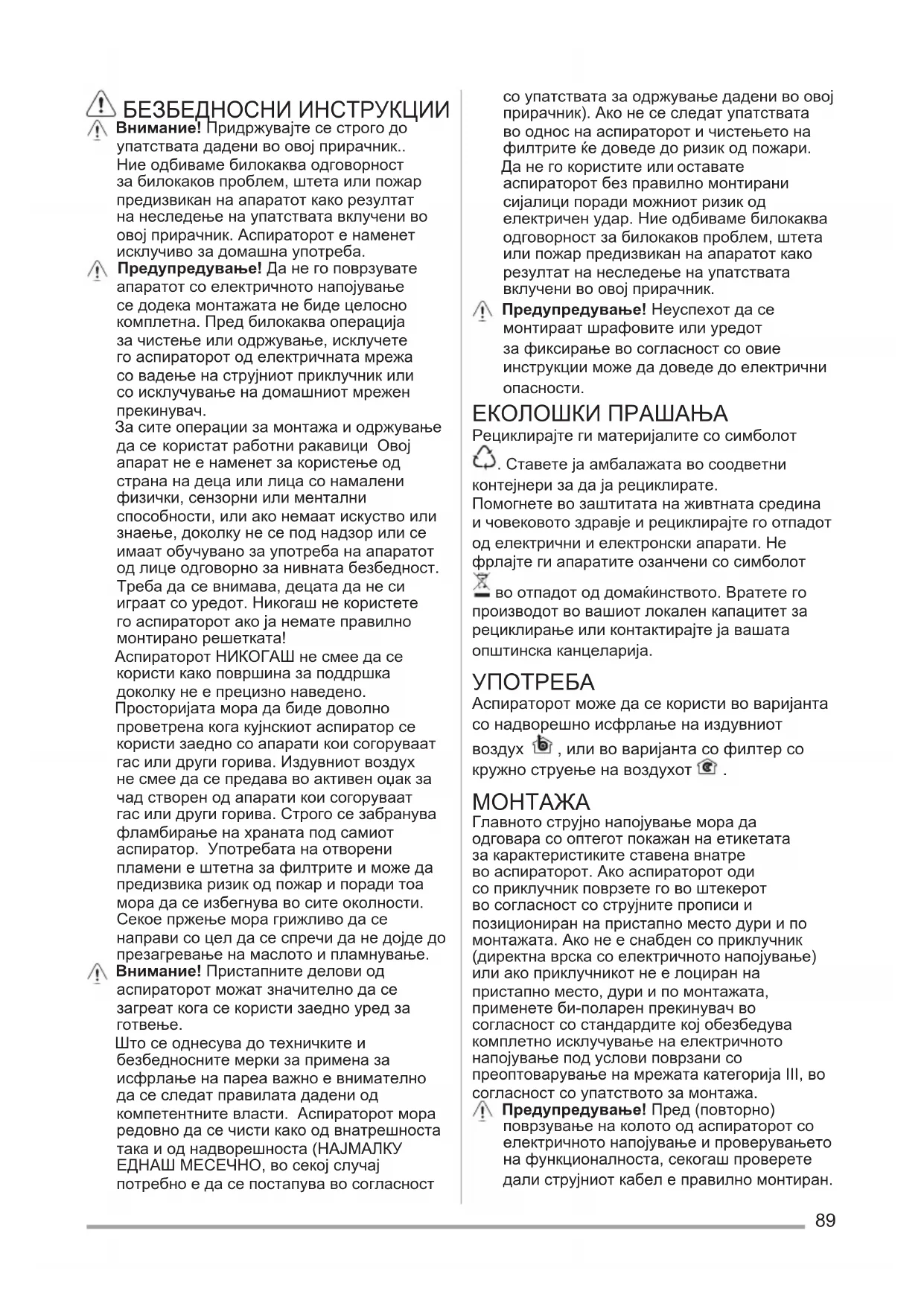 се внимава, децата да не си играат со уредот. Никогаш не користете го аспираторот ако ја немате правилно монтирано решетката! Аспираторот НИКОГАШ не смее да се користи како површина за поддршка доколку не е прецизно наведено. Просторијата мора да биде доволно проветрена кога кујнскиот аспиратор се користи заедно со апарати кои согоруваат гас или други горива. Издувниот воздух не смее да се предава во активен оџак за чад створен од апарати кои согоруваат гас или други горива. Строго се забранува фламбирање на храната под самиот аспиратор. Употребата на отворени пламени е штетна за филтрите и може да предизвика ризик од пожар и поради тоа мора да се избегнува во сите околности. Секое пржење мора грижливо да се направи со цел да се спречи да не дојде до презагревање на маслото и пламнување. Внимание! Пристапните делови од аспираторот можат значително да се загреат кога се користи заедно уред за