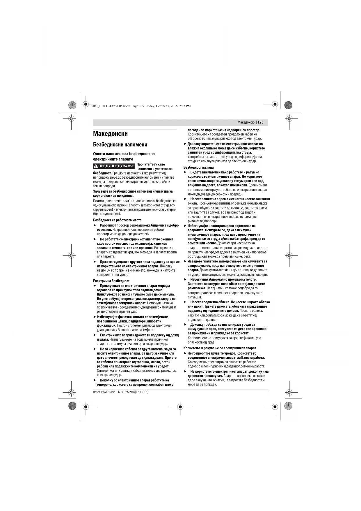 Носете соодветна облека. Не носете широка облека или накит. Тргнете ја косата, облеката и ракавиците подалеку од подвижните делови. Лесната облека, накитот или долгата коса може да се зафатат од подвижните делови. Доколку треба да се инсталираат уреди за вшмукување прав, осигурете се дека тие правилно се приклучени и прикладно се користат. Користењето на вшмукувач за прав не ја намалува опасноста од прав. Користење и ракување со електричниот апарат Не го преоптоварувајте уредот. Користете го соодветниот електричен апарат за Вашата работа. Со соодветниот електричен апарат ќе работите подобро и посигурно во зададениот домен на работа. Не користете го електричниот апарат, доколку има дефектен прекинувач. Апаратот кој повеќе не може да се вклучи или исклучи, ја загрозува безбедноста и мора да се поправи. ПРЕДУПРЕДУВАЊЕ OBJ_BUCH-1398-005.book Page 125 Friday, October 7, 2016 2:07 PM126 | Македонски 1 609 92A 2MC | (7.10.16) Bosch Power Tools Извлечете го приклучокот од ѕидната дозна и/или извадете ја батеријата, пред да ги смените поставките на уредот, да ги замените деловите или да го тргнете настрана уредот. Овие мерки за предупредување го спречуваат невнимателниот старт на електричниот уред. Чувајте ги подалеку од дофатот на деца електричните апарати кои не ги користите. Овој уред не смее да го користат лица кои не се запознаени со него или не ги имаат прочитано овие упатства. Електричните апарати се опасни, доколку ги користат неискусни лица. Одржувајте ги грижливо електричните апарати. Проверете дали подвижните делови функционираат беспрекорно и не се заглавени, дали се скршени или оштетени, што може да ја попречи функцијата на електричниот апарат. Поправете ги оштетените делови пред користењето на уредот. Многу несреќи својата причина ја имаат во лошо одржуваните електрични апарати. Алатот за сечење одржувајте го остар и чист. Внимателно одржуваните алати за сечење со остри рабови за сечење помалку се заглавуваат и со нив полесно се работи. Користете ги електричните апарати, опремата, додатоците за алатите итн. во согласност со ова упатство. Притоа земете ги во обѕир работните услови и дејноста што треба да се изврши. Користењето на електрични апарати за друга употреба освен наведената може да доведе до опасни ситуации. Користење и ракување на батерискиот апарат Батериите полнете ги со полначи што се препорачани исклучиво од производителот. Доколку полначот кој е прилагоден на еден соодветен вид батерии, го користите со други батерии, постои опасност од пожар. Затоа користете батерии кои се предвидени за електричниот апарат. Користењето друг вид батерии може да доведе до повреди и опасност од пожар. Неупотребената батерија држете ја подалеку од канцелариски спојувалки, клучеви, железни пари, клинци, шрафови или други мали метални предмети, што може да предизвикаат премостување на контактите. Краток спој меѓу контактите на батеријата може да предизвика изгореници или пожар. При погрешно користење, може да истече течноста од батеријата. Избегнувајте контакт со неа. Доколку случајно дојдете во контакт со течноста, исплакнете ја со вода. Доколку течноста дојде во контакт со очите, побарајте лекарска помош. Истечената течност од батеријата може да предизвика кожни иритации или изгореници.