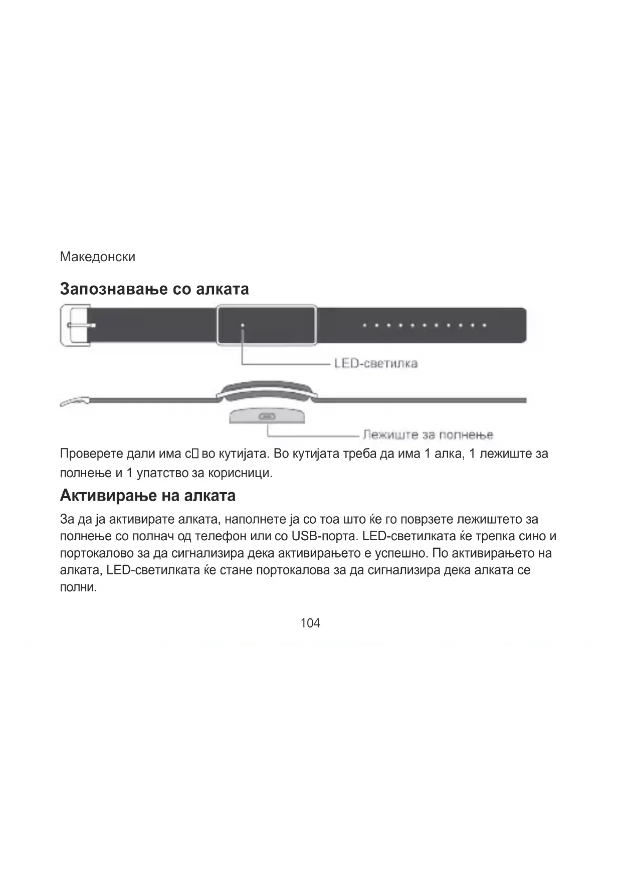 во кутијата. Во кутијата треба да има 1 алка, 1 лежиште за полнење и 1 упатство за корисници. Активирање на алката За да ја активирате алката, наполнете ја со тоа што ќе го поврзете лежиштето за полнење со полнач од телефон или со USB-порта. LED-светилката ќе трепка сино и портокалово за да сигнализира дека активирањето е успешно. По активирањето на алката, LED-светилката ќе стане портокалова за да сигнализира дека алката се полни.Македонски
