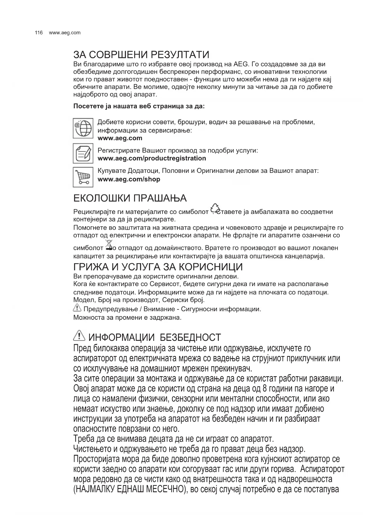 ЗА СОВРШЕНИ РЕЗУЛТАТИ Ви благодариме што го избравте овој производ на AEG. Го создадовме за да ви обезбедиме долгогодишен беспрекорен перформанс, со иновативни технологии кои го прават животот поедноставен - функции што можеби нема да ги најдете кај обичните апарати. Ве молиме, одвојте неколку минути за читање за да го добиете најдоброто од овој апарат. Посетете ја нашата веб страница за да: Добиете корисни совети, брошури, водич за решавање на проблеми, информации за сервисирање: www.aeg.com Регистрирате Вашиот производ за подобри услуги: www.aeg.com/productregistration Купувате Додатоци, Половни и Оригинални делови за Вашиот апарат: www.aeg.com/shop ЕКОЛОШКИ ПРАШАЊА Рециклирајте ги материјалите со симболот . Ставете ја амбалажата во соодветни контејнери за да ја рециклирате. Помогнете во заштитата на живтната средина и човековото здравје и рециклирајте го отпадот од електрични и електронски апарати. Не фрлајте ги апаратите озанчени со симболот во отпадот од домаќинството. Вратете го производот во вашиот локален капацитет за рециклирање или контактирајте ја вашата општинска канцеларија. ГРИЖА И УСЛУГА ЗА КОРИСНИЦИ Ви препорачуваме да користите оригинални делови. Кога ќе контактирате со Сервисот, бидете сигурни дека ги имате на располагање следниве податоци. Информациите може да ги најдете на плочката со податоци. Модел, Број на производот, Сериски број. Предупредување / Внимание - Сигурносни информации. Можноста за промени е задржана. ИНФОРМАЦИИ БЕЗБЕДНОСТ Пред билокаква операција за чистење или одржување, исклучете го аспираторот од електричната мрежа со вадење на струјниот приклучник или со исклучување на домашниот мрежен прекинувач. За сите операции за монтажа и одржување да се користат работни ракавици. Овој апарат може да се користи од страна на деца од 8 години па нагоре и лица со намалени физички, сензорни или ментални способности, или ако немаат искуство или знаење, доколку се под надзор или имаат добиено инструкции за употреба на апаратот на безбеден начин и ги разбираат опасностите поврзани со него. Треба да се внимава децата да не си играат со апаратот. Чистењето и одржувањето не треба да го прават деца без надзор. Просторијата мора да биде доволно проветрена кога кујнскиот аспиратор се користи заедно со апарати кои согоруваат гас или други горива. Аспираторот мора редовно да се чисти како од внатрешноста така и од надворешноста (НАЈМАЛКУ ЕДНАШ МЕСЕЧНО), во секој случај потребно е да се постапува MK УПАТСТВО ЗА КОРИСНИК117