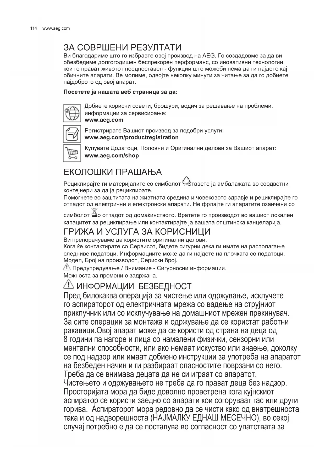 ЗА СОВРШЕНИ РЕЗУЛТАТИ Ви благодариме што го избравте овој производ на AEG. Го создадовме за да ви обезбедиме долгогодишен беспрекорен перформанс, со иновативни технологии кои го прават животот поедноставен - функции што можеби нема да ги најдете кај обичните апарати. Ве молиме, одвојте неколку минути за читање за да го добиете најдоброто од овој апарат. Посетете ја нашата веб страница за да: Добиете корисни совети, брошури, водич за решавање на проблеми, информации за сервисирање: www.aeg.com Регистрирате Вашиот производ за подобри услуги: www.aeg.com/productregistration Купувате Додатоци, Половни и Оригинални делови за Вашиот апарат: www.aeg.com/shop ЕКОЛОШКИ ПРАШАЊА Рециклирајте ги материјалите со симболот . Ставете ја амбалажата во соодветни контејнери за да ја рециклирате. Помогнете во заштитата на живтната средина и човековото здравје и рециклирајте го отпадот од електрични и електронски апарати. Не фрлајте ги апаратите озанчени со симболот во отпадот од домаќинството. Вратете го производот во вашиот локален капацитет за рециклирање или контактирајте ја вашата општинска канцеларија. ГРИЖА И УСЛУГА ЗА КОРИСНИЦИ Ви препорачуваме да користите оригинални делови. Кога ќе контактирате со Сервисот, бидете сигурни дека ги имате на располагање следниве податоци. Информациите може да ги најдете на плочката со податоци. Модел, Број на производот, Сериски број. Предупредување / Внимание - Сигурносни информации. Можноста за промени е задржана. ИНФОРМАЦИИ БЕЗБЕДНОСТ Пред билокаква операција за чистење или одржување, исклучете го аспираторот од електричната мрежа со вадење на струјниот приклучник или со исклучување на домашниот мрежен прекинувач. За сите операции за монтажа и одржување да се користат работни ракавици.Овој апарат може да се користи од страна на деца од 8 години па нагоре и лица со намалени физички, сензорни или ментални способности, или ако немаат искуство или знаење, доколку се под надзор или имаат добиено инструкции за употреба на апаратот на безбеден начин и ги разбираат опасностите поврзани со него. Треба да се внимава децата да не си играат со апаратот. Чистењето и одржувањето не треба да го прават деца без надзор. Просторијата мора да биде доволно проветрена кога кујнскиот аспиратор се користи заедно со апарати кои согоруваат гас или други горива. Аспираторот мора редовно да се чисти како од внатрешноста така и од надворешноста (НАЈМАЛКУ ЕДНАШ МЕСЕЧНО), во секој случај потребно е да се постапува во согласност со упатствата за MK УПАТСТВО ЗА КОРИСНИК115