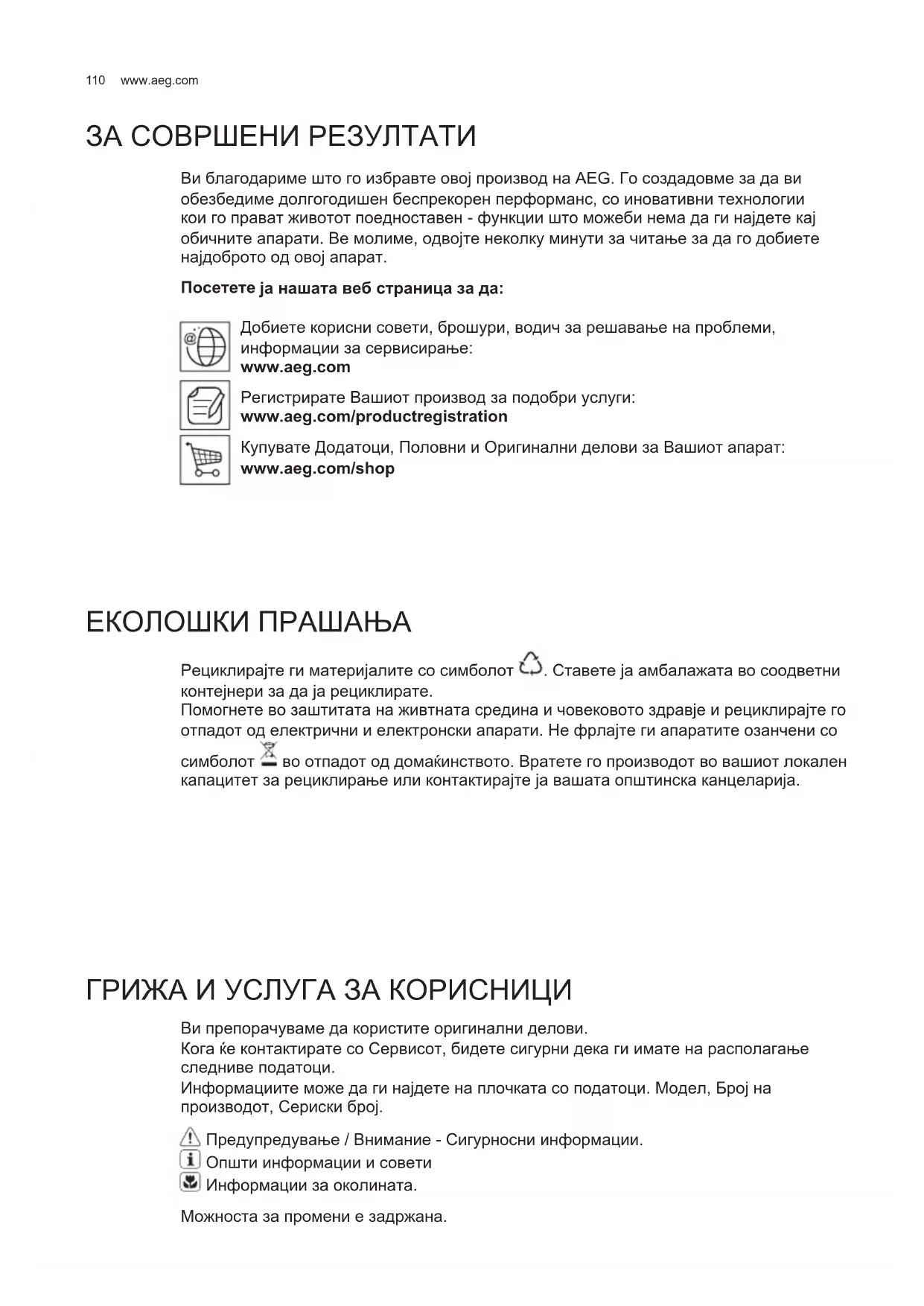 ја нашата веб страница за да: Добиете корисни совети, брошури, водич за решавање на проблеми, информации за сервисирање: www.aeg.com Регистрирате Вашиот производ за подобри услуги: www.aeg.com/productregistration Купувате Додатоци, Половни и Оригинални делови за Вашиот апарат: www.aeg.com/shop ЕКОЛОШКИ ПРАШАЊА Рециклирајте ги материјалите со симболот . Ставете ја амбалажата во соодветни контејнери за да ја рециклирате. Помогнете во заштитата на живтната средина и човековото здравје и рециклирајте го отпадот од електрични и електронски апарати. Не фрлајте ги апаратите озанчени со симболот во отпадот од домаќинството. Вратете го производот во вашиот локален капацитет за рециклирање или контактирајте ја вашата општинска канцеларија. ГРИЖА И УСЛУГА ЗА КОРИСНИЦИ Ви препорачуваме да користите оригинални делови. Кога ќе контактирате со Сервисот, бидете сигурни дека ги имате на располагање следниве податоци. Информациите може да ги најдете на плочката со податоци. Модел, Број на производот, Сериски број. Предупредување / Внимание - Сигурносни информации. Општи информации и совети Информации за околината. Можноста за промени е задржана. MK УПАТСТВО ЗА КОРИСНИК111