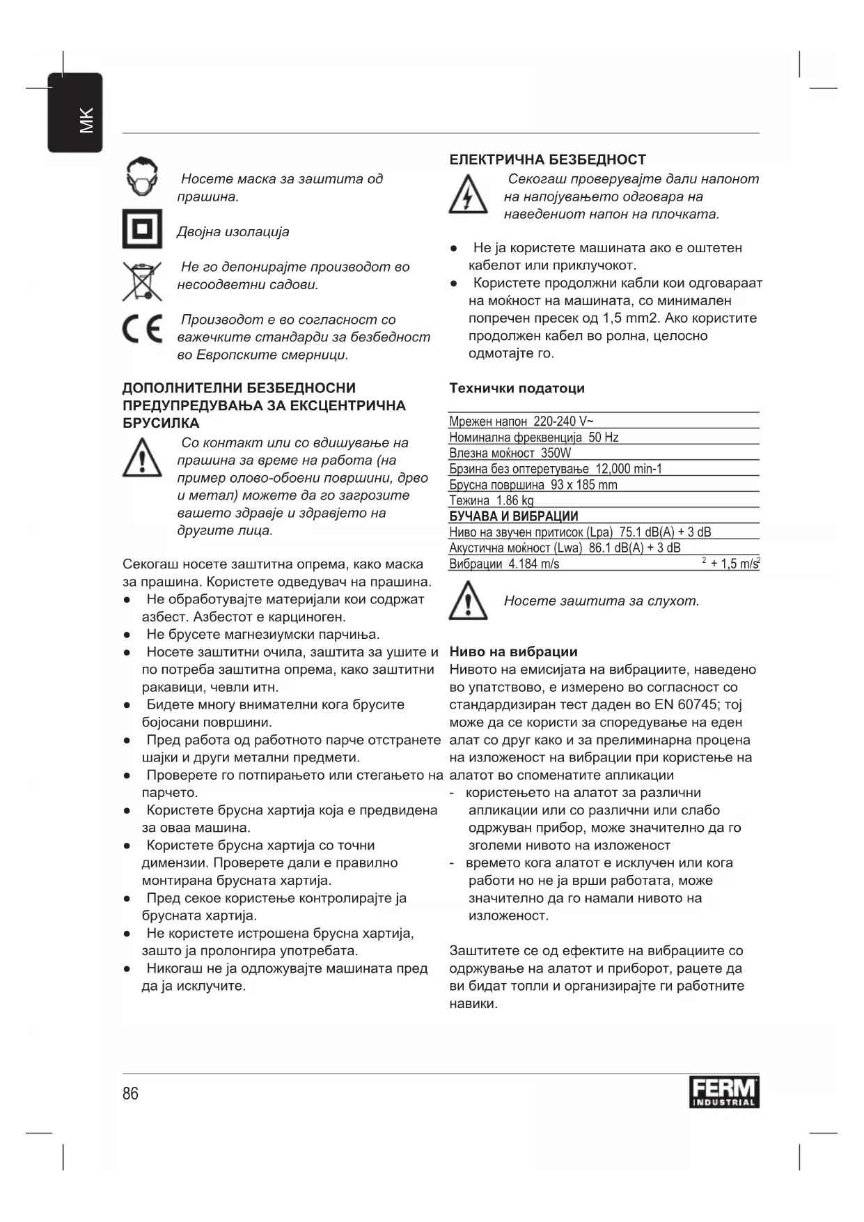 ● Користете брусна хартија која е предвидена за оваа машина. ● Користете брусна хартија со точни димензии. Проверете дали е правилно монтирана брусната хартија. ● Пред секое користење контролирајте ја брусната хартија. ● Не користете истрошена брусна хартија, зашто ја пролонгира употребата. ● Никогаш не ја одложувајте машината пред да ја исклучите. ЕЛЕКТРИЧНА БЕЗБЕДНОСТ Секогаш проверувајте дали напонот на напојувањето одговара на наведениот напон на плочката. ● Не ја користете машината ако е оштетен кабелот или приклучокот. ● Користете продолжни кабли кои одговараат на моќност на машината, со минимален попречен пресек од 1,5 mm2. Ако користите продолжен кабел во ролна, целосно одмотајте го. Технички податоци Мрежен напон 220-240 V~ Номинална фреквенција 50 Hz Влезна моќност 350W Брзина без оптеретување 12,000 min-1 Брусна површина 93 x 185 mm Тежина 1.86 kg БУЧАВА И ВИБРАЦИИ Ниво на звучен притисок (Lpa) 75.1 dB(A) + 3 dB Акустична моќност (Lwa) 86.1 dB(A) + 3 dB Вибрации 4.184 m/s