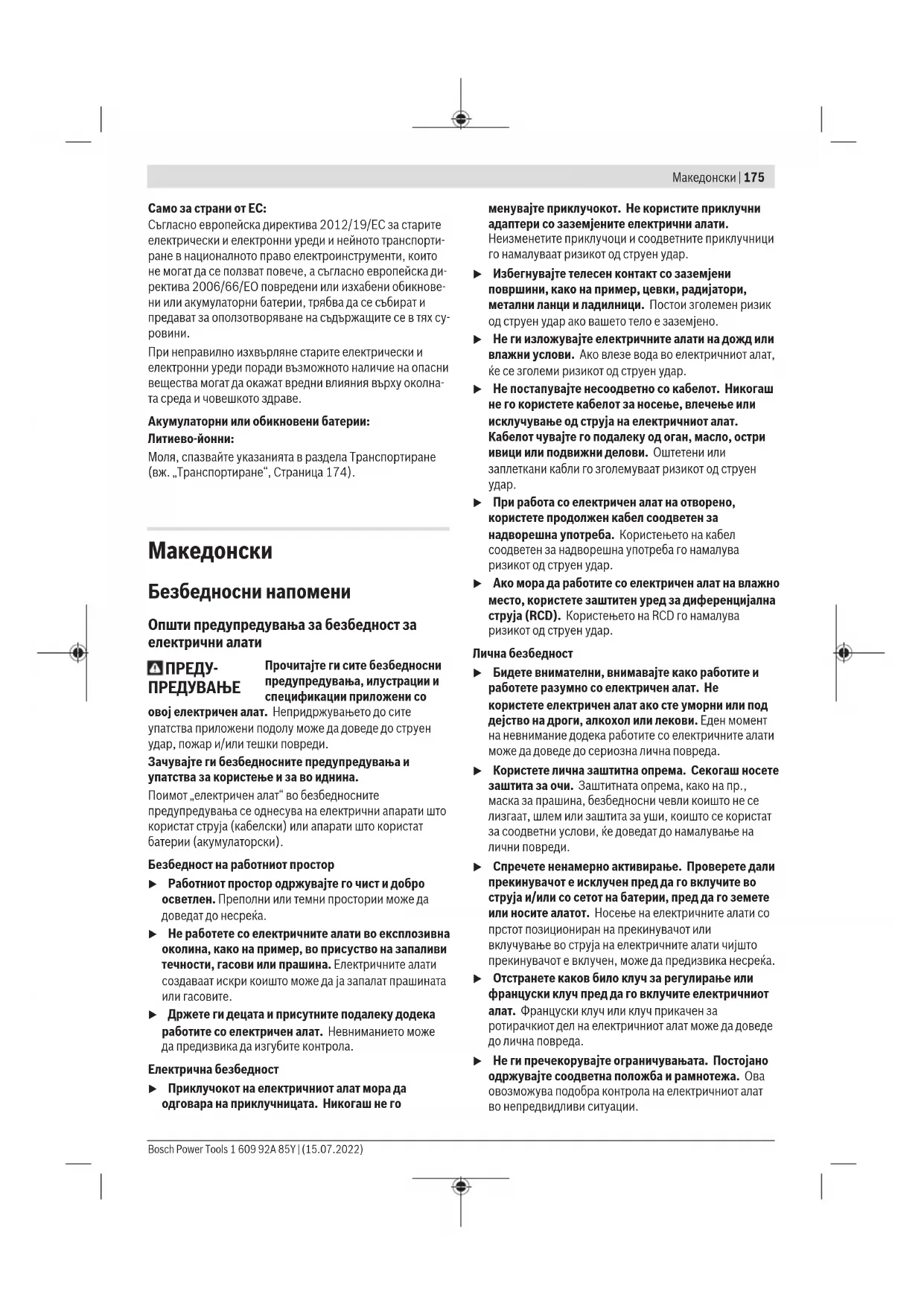 u При работа со електричен алат на отворено, користете продолжен кабел соодветен за надворешна употреба. Користењето на кабел соодветен за надворешна употреба го намалува ризикот од струен удар. u Ако мора да работите со електричен алат на влажно место, користете заштитен уред за диференцијална струја (RCD). Користењето на RCD го намалува ризикот од струен удар. Лична безбедност u Бидете внимателни, внимавајте како работите и работете разумно со електричен алат. Не користете електричен алат ако сте уморни или под дејство на дроги, алкохол или лекови. Еден момент на невнимание додека работите со електричните алати може да доведе до сериозна лична повреда. u Користете лична заштитна опрема. Секогаш носете заштита за очи. Заштитната опрема, како на пр., маска за прашина, безбедносни чевли коишто не се лизгаат, шлем или заштита за уши, коишто се користат за соодветни услови, ќе доведат до намалување на лични повреди. u Спречете ненамерно активирање. Проверете дали прекинувачот е исклучен пред да го вклучите во струја и/или со сетот на батерии, пред да го земете или носите алатот. Носење на електричните алати со прстот позициониран на прекинувачот или вклучување во струја на електричните алати чијшто прекинувачот е вклучен, може да предизвика несреќа. u Отстранете каков било клуч за регулирање или француски клуч пред да го вклучите електричниот алат. Француски клуч или клуч прикачен за ротирачкиот дел на електричниот алат може да доведе до лична повреда. u Не ги пречекорувајте ограничувањата. Постојано одржувајте соодветна положба и рамнотежа. Ова овозможува подобра контрола на електричниот алат во непредвидливи ситуации. Bosch Power Tools 1 609 92A 85Y | (15.07.2022)176 | Македонски u Облечете се соодветно. Не носете широка облека и накит. Косата и алиштата треба да бидат подалеку од подвижните делови. Широката облека, накитот или долгата коса може да се закачат за подвижните