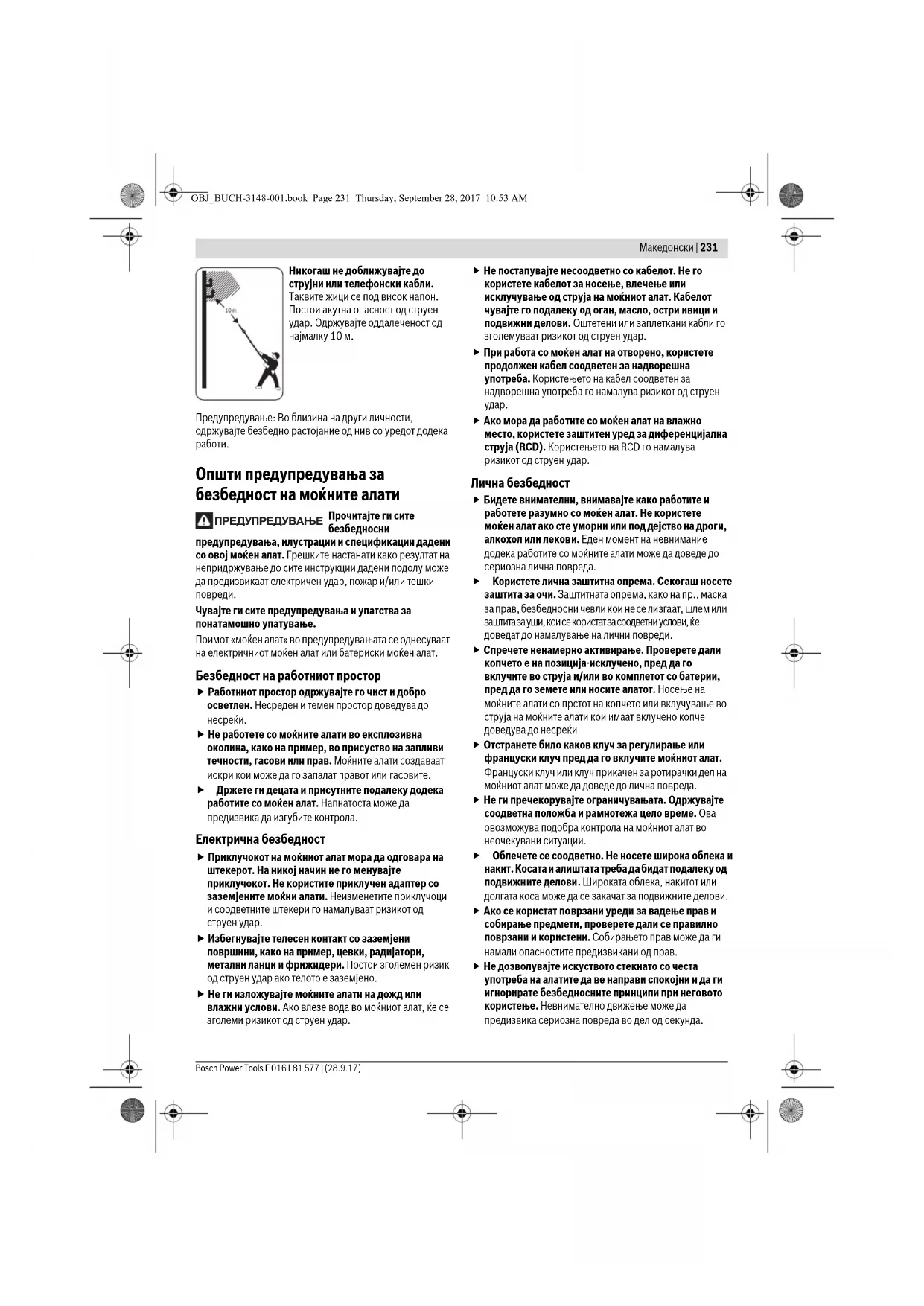 Не користете ја косачката кога врне и не излагајте ја на дожд. Внимавајте предмети коишто летаат од косачка та да не ги пов реда т личностите коишто стојат околу уредот. Предупредување: Држете се на безбедно растојание од косачката додека таа работи. Секогаш носете заштитни ракавици и наочари. Се препорачува и носење на сигурносни нелизгачки кондури и заштитен шлем. Соодветна заштитна облека ја намалува опасноста од повреда од паднати гранки и случаен допир со сечилото. OBJ_BUCH-3148-001.book Page 230 Thursday, September 28, 2017 10:53 AMМакедонски | 231 Bosch Power Tools F 016 L81 577 | (28.9.17) Никогаш не доближувајте до струјни или телефонски кабли. Таквите жици се под висок напон. Постои акутна опасност од струен удар. Одржувајте оддалеченост од најмалку 10 м. Предупредување: Во близина на други личности, одржувајте безбедно растојание од нив со уредот додека