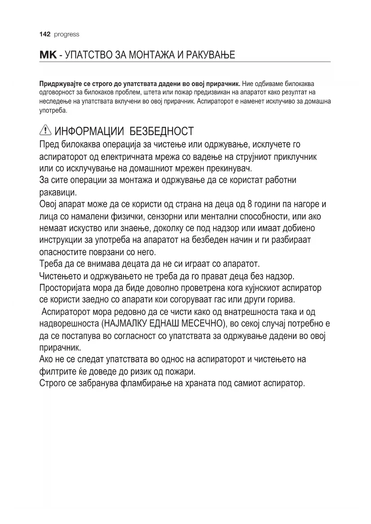 Ако не се следат упатствата во однос на аспираторот и чистењето на филтрите ќе доведе до ризик од пожари. Строго се забранува фламбирање на храната под самиот аспиратор.progress 143 ИНСТРУКЦИИ ЗА