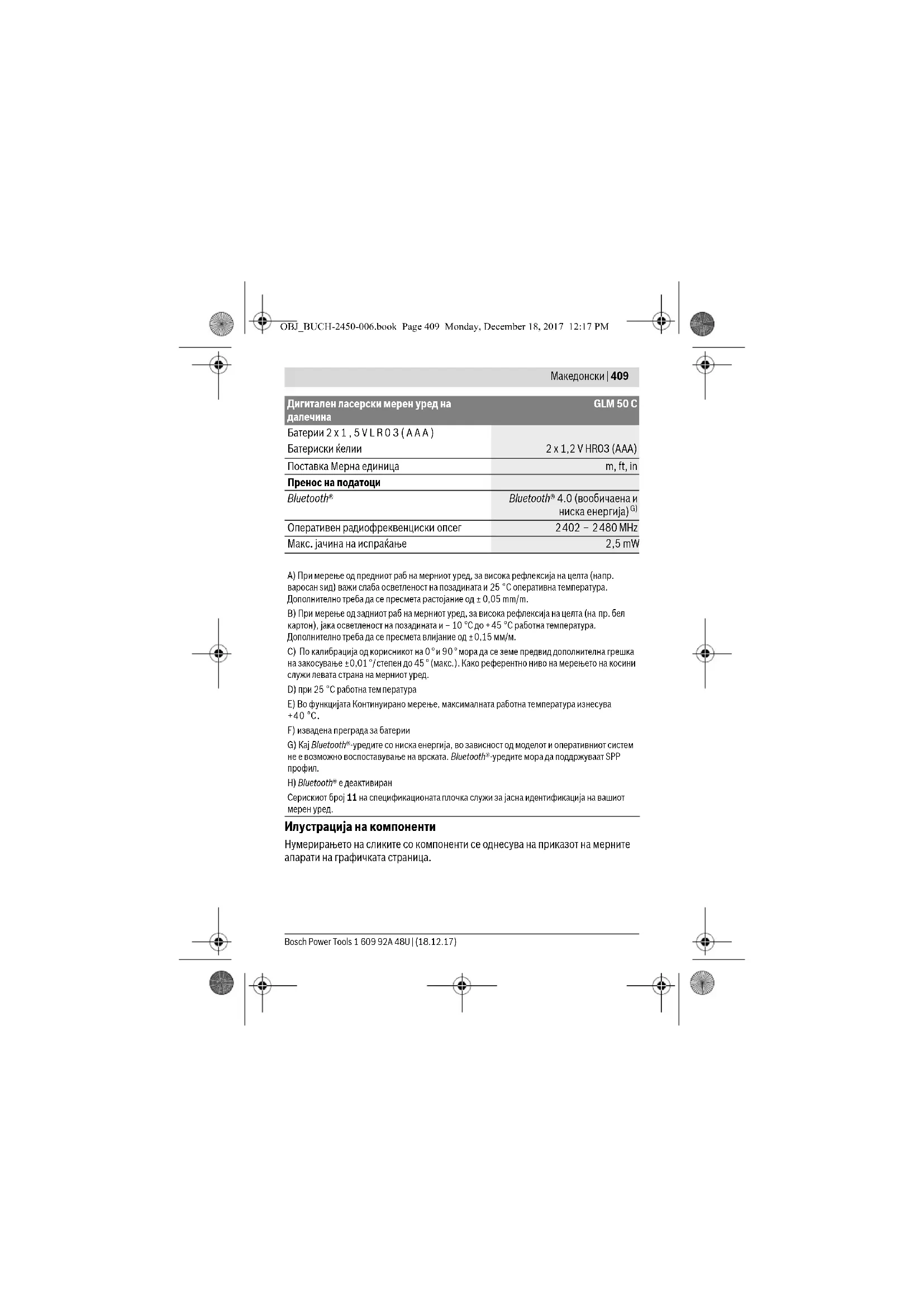 Оперативен радиофреквенциски опсег 2402 – 2480 MHz Макс. јачина на испраќање 2,5 mW A) При мерење од предниот раб на мерниот уред, за висока рефлексија на целта (напр. варосан ѕид) важи слаба осветленост на позадината и 25 °C оперативна температура. Дополнително треба да се пресмета растојание од ± 0,05 mm/m. B) При мерење од задниот раб на мерниот уред, за висока рефлексија на целта (на пр. бел картон), јака осветленост на позадината и – 10 °C до +45 °C работна температура. Дополнително треба да се пресмета влијание од ±0,15 мм/м. C) По калибрација од корисникот на 0 ° и 90 ° мора да се земе предвид дополнителна грешка на закосување ±0,01 °/степен до 45 ° (макс.). Како референтно ниво на мерењето на косини служи левата страна на мерниот уред. D) при 25 °C работна тем