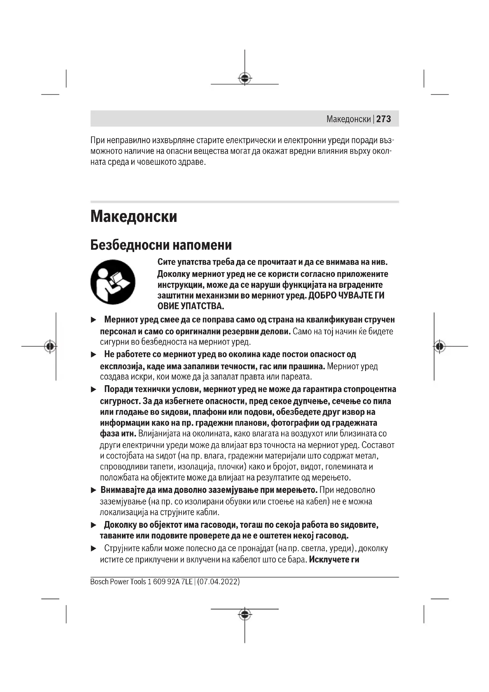 Безбедносни напомени Сите упатства треба да се прочитаат и да се внимава на нив. Доколку мерниот уред не се користи согласно приложените инструкции, може да се наруши функцијата на вградените заштитни механизми во мерниот уред. ДОБРО ЧУВАЈТЕ ГИ ОВИЕ УПАТСТВА. u Мерниот уред смее да се поправа само од страна на квалификуван стручен персонал и само со оригинални резервни делови. Само на тој начин ќе бидете сигурни во безбедноста на мерниот уред. u Не работете со мерниот уред во околина каде постои опасност од експлозија, каде има запаливи течности, гас или прашина. Мерниот уред создава искри, кои може да ја запалат правта или пареата. u Поради технички услови, мерниот уред не може да гарантира стопроцентна сигурност. За да избегнете опасности, пред секое дупчење, сечење со пила или глодање во ѕидови, плафони или подови, обезбедете друг извор на информации како на пр. градежни планови, фотографии од градежната фаза итн. Влијанијата на околината, како влагата на воздухот или близината со други електрични уреди може да влијаат врз точноста на мерниот уред. Составот и состојбата на ѕидот (на пр. влага, градежни материјали што содржат метал, спроводливи тапети, изолација, плочки) како и бројот, видот, големината и положбата на објектите може да влијаат на резултатите од мерењето. u Внимавајте да има доволно заземјување при мерењето. При недоволно заземјување (на пр. со изолирани обувки или стоење на кабел) не е можна локализација на струјните кабли. u Доколку во објектот има гасоводи, тогаш по секоја работа во ѕидовите, таваните или подовите проверете да не е оштетен некој гасовод. u Струјните кабли може полесно да се пронајдат (на пр. светла, уреди), доколку истите се приклучени и вклучени на кабелот што се бара. Исклучете ги Bosch Power Tools 1 609 92A 7LE | (07.04.2022)274 | Македонски струјните потрошувачи и кабли, пред да дупчите во ѕидови, плафони или подови, сечете или глодате. По сите работи проверете на подлогата да нема предмети кои се под напон. u При прицврстување на предмети на суви ѕидови проверете дали има доволна носивост на ѕидот одн. на материјалите за прицврстување, особено при прицврстување на потконструкција. Опис на производот и перформансите Внимавајте на сликите во предниот дел на упатството за користење. Употреба со соодветна намена Мерниот уред е наменет за детектирање на метали (железо и неметали, на пр. армирано железо), дрвени греди, како и струјни кабли во ѕидови, плафони и