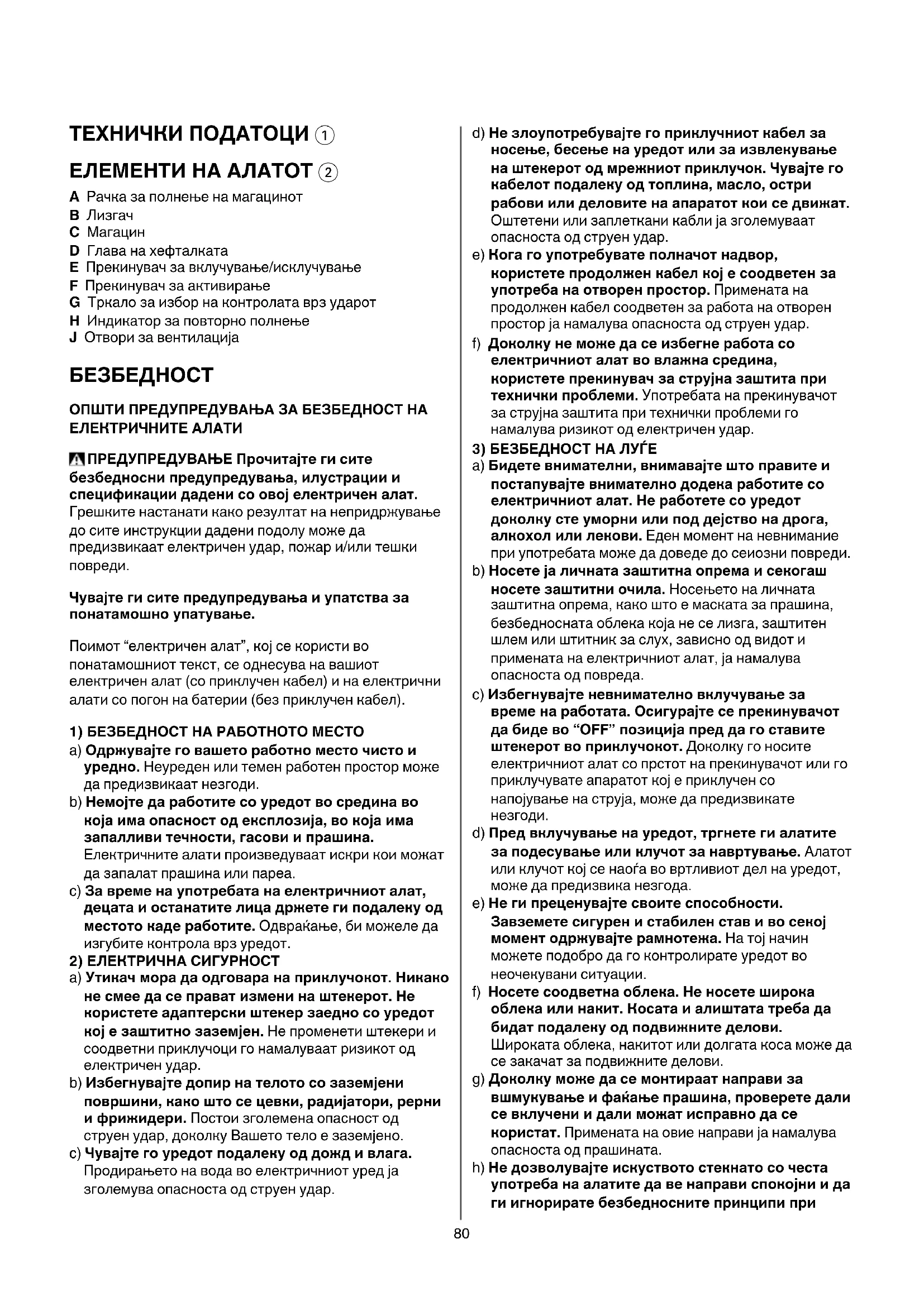 ОПШТИ ПРЕДУПРЕДУВАЊА ЗА БЕЗБЕДНОСТ НА ЕЛЕКТРИЧНИТЕ АЛАТИ ПРЕДУПРЕДУВАЊЕ Прочитајте ги сите безбедносни предупредувања, илустрации и спецификации дадени со овој електричен алат. Грешките настанати како резултат на непридржување до сите инструкции дадени подолу може да предизвикаат електричен удар, пожар и/или тешки
