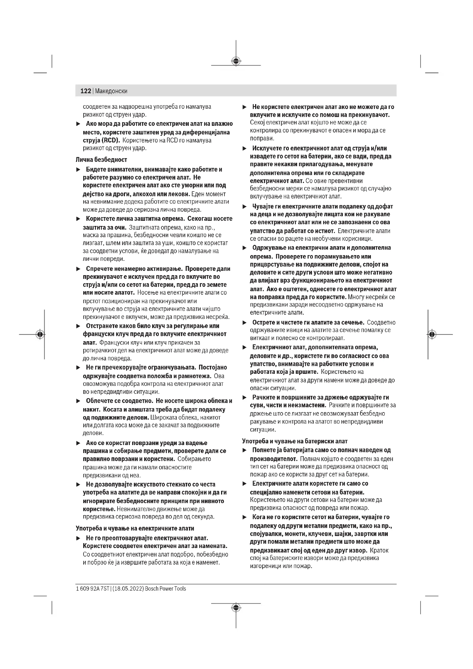 u При работа со електричен алат на отворено, користете продолжен кабел соодветен за надворешна употреба. Користењето на кабел Bosch Power Tools 1 609 92A 7ST | (18.05.2022)122 | Македонски соодветен за надворешна употреба го намалува ризикот од струен удар. u Ако мора да работите со електричен алат на влажно место, користете заштитен уред за диференцијална струја (RCD). Користењето на RCD го намалува ризикот од струен удар. Лична безбедност u Бидете внимателни, внимавајте како работите и работете разумно со електричен алат. Не користете електричен алат ако сте уморни или под дејство на дроги, алкохол или лекови. Еден момент на невнимание додека работите со електричните алати може да доведе до сериозна лична повреда. u Користете лична заштитна опрема. Секогаш носете заштита за очи. Заштитната опрема, како на пр., маска за прашина, безбедносни чевли коишто не се лизгаат, шлем или заштита за уши, коишто се користат за соодветни услови, ќе доведат до намалување на лични повреди. u Спречете ненамерно активирање. Проверете дали прекинувачот е исклучен пред да го вклучите во струја и/или со сетот на батерии, пред да го земете или носите алатот. Носење на електричните алати со прстот позициониран на прекинувачот или вклучување во струја на електричните алати чијшто прекинувачот е вклучен, може да предизвика несреќа. u Отстранете каков било клуч за регулирање или француски клуч пред да го вклучите електричниот алат. Француски клуч или клуч прикачен за ротирачкиот дел на електричниот алат може да доведе до лична повреда. u Не ги пречекорувајте ограничувањата. Постојано одржувајте соодветна положба и рамнотежа. Ова овозможува подобра контрола на електричниот алат во непредвидливи ситуации. u Облечете се соодветно. Не носете широка облека и накит. Косата и алиштата треба да бидат подалеку од подвижните делови. Широката облека, накитот или долгата коса може да се закачат за подвижните