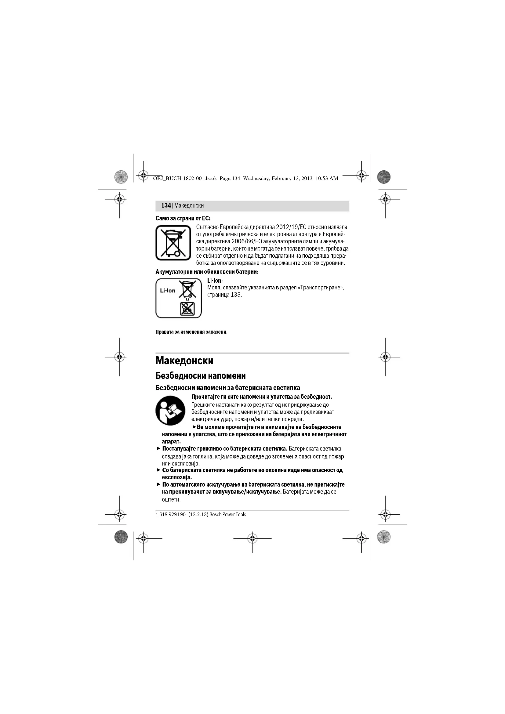 Литиум-јонските батерии подлежат на барањата на Законот за опасни материјали. Батериите може да се транспортираат само од страна на корисникот, без потреба од дополнителни квалификации. При пренос на истите од страна на трети лица (на пр. воздушен транспорт или шпедиција) неопходно е да се внимава на специјалните напомени на амбалажата и ознаките. Во таков случај, при подготовката на пратката мора да се повика експерт за опасни супстанци. Транспортирајте ги батериите само доколку куќиштето е неоштетено. Залепете ги отворените контакти и спакувајте ја батеријата на тој начин што нема да се движи во амбалажата. Ве молиме внимавајте на евентуалните дополнителни национални прописи. OBJ_BUCH-1802-001.book Page 139 Wednesday, February 13, 2013 10:53 AM140 | Македонски 1 619 929 L90 | (13.2.13) Bosch Power Tools Отстранување Батериските светилки, опремата и амбалажите треба да се отстранат на еколошки прифатлив начин. Не ги фрлајте батериските светилки во домашната канта за ѓубре! Само за земји во рамки на ЕУ Според Европската регулатива 2012/19/EU за стари електрични и електронски уреди, батериските светилки што се вон употреба и дефектните или искористените батерии според регулативата 2006/66/EG мора одделно да се собираат и да се рециклираат на еколошки прифатлив начин. Батериите што се вон употреба може директно да ги доставите во: