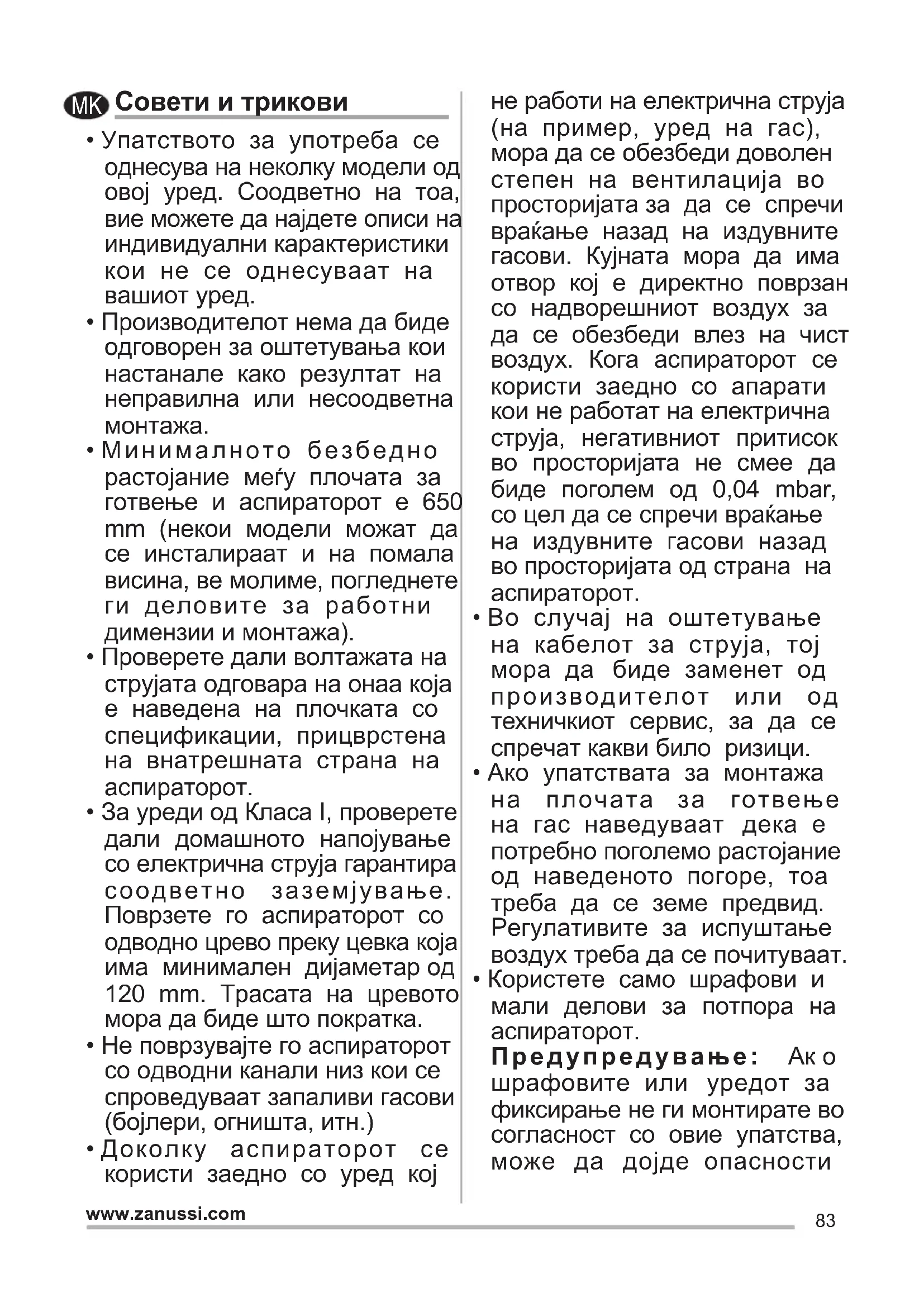 - Користете само шрафови и мали делови за потпора на аспираторот. Предупредување: Ак о шрафовите или уредот за фиксирање не ги монтирате во согласност со овие упатства, може да дојде опасности MK84 www.zanussi.com поврзани со струјата.