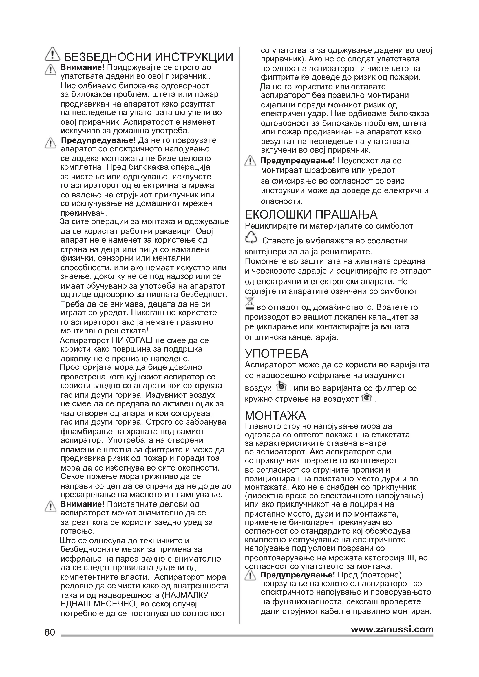 (3.), средна (4.), максимална (5.). Ако при готвене се отделя много пара, преминете на максимален режим на работа. Препоръчително е да включите аспиратора 5 минути преди да започнете да готвите и да го оставите да работи още 15 минути след като приключите. ОСВЕТИТЕЛН ПРИБОР Аспираторът разполага с осветителна система със СВЕТОДИОДИ. СВЕТОДИОДИТЕ гарантират оптимално осветление, до 10 пъти по-силно от традиционните лампи и позволяват 90% икономия на електроенергия. Внимание! Не гледайте директно светлината на светодиодите! За подмяна се обърнете към сервиза за техническо обслужване.80 www.zanussi.com БЕЗБЕДНОСНИ ИНСТРУКЦИИ Внимание! Придржувајте се строго до упатствата дадени во овој прирачник.. Ние одбиваме билокаква одговорност за билокаков проблем, штета или пожар предизвикан на апаратот како резултат на неследење на упатствата вклучени во овој прирачник. Аспираторот е наменет исклучиво за домашна употреба. Предупредување! Да не го поврзувате апаратот со електричното напојување се додека монтажата не биде целосно комплетна. Пред билокаква операција за чистење или одржување, исклучете го аспираторот од електричната мрежа со вадење на струјниот приклучник или со исклучување на домашниот мрежен прекинувач. За сите операции за монтажа и одржување