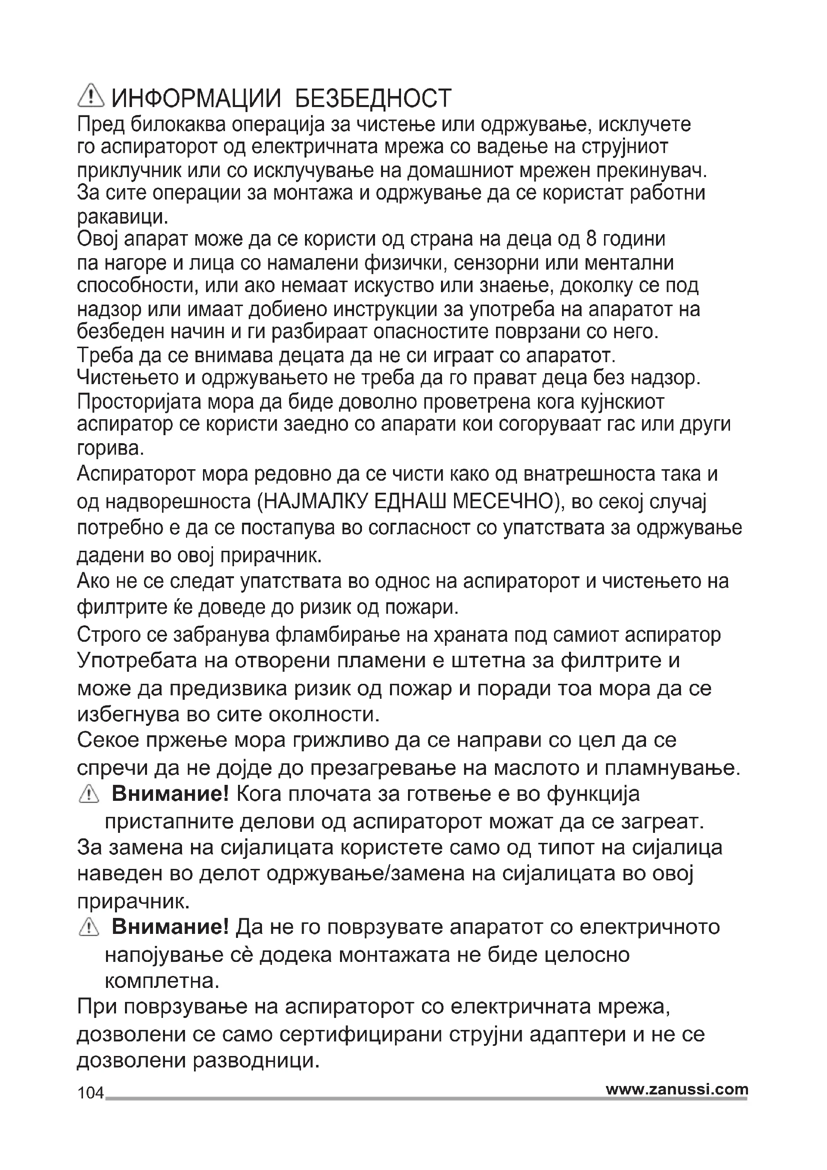 При поврзување на аспираторот со електричната мрежа, дозволени се само сертифицирани струјни адаптери и не се дозволени разводници.105 www.zanussi.com ИНСТРУКЦИИ ЗА БЕЗБЕДНОСТ Што се однесува до техничките и безбедносните мерки за примена за исфрлање на пареа важно е внимателно да се следат правилата дадени од локалните надлежни власти. Издувниот воздух не смее да се предава во активен оџак за чад створен од апарати кои согоруваат гас или други горива. Да не го користите или оставате аспираторот без правилно монтирани сијалици поради можниот ризик од електричен удар. Никогаш не користете го аспираторот ако ја немате правилно монтирано решетката! Аспираторот НИКОГАШ не смее да се користи како површина за поддршка доколку не е прецизно наведено. Користете ги само завртките за прицврстување обезбедени со производот за монтирање или ако не се обезбедени набавете го точниот тип на завртки. Користете ја точната должина за завртките што се наведени во Упатството за монтирање. Во случај на сомневање, консултирајте се со овластениот центар за техничка поддршка или персонал со слични квалификации. ВНИМАНИЕ! Немонтирањето на завртки и уреди за прицврстување во согласност со овие упатства може да доведе до опасности од електрична природа. EКОЛОШКА ПРАШАЊА Рециклирајте ги материјалите со симболот . Ставете ја амбалажата во соодветни контејнери за да ја рециклирате. Помогнете во заштитата на живтната средина и човековото здравје и рециклирајте го отпадот од електрични и електронски апарати. Не фрлајте ги апаратите озанчени со симболот во отпадот од домаќинството. Вратете го производот во вашиот локален капацитет за рециклирање или контактирајте ја вашата општинска канцеларија.