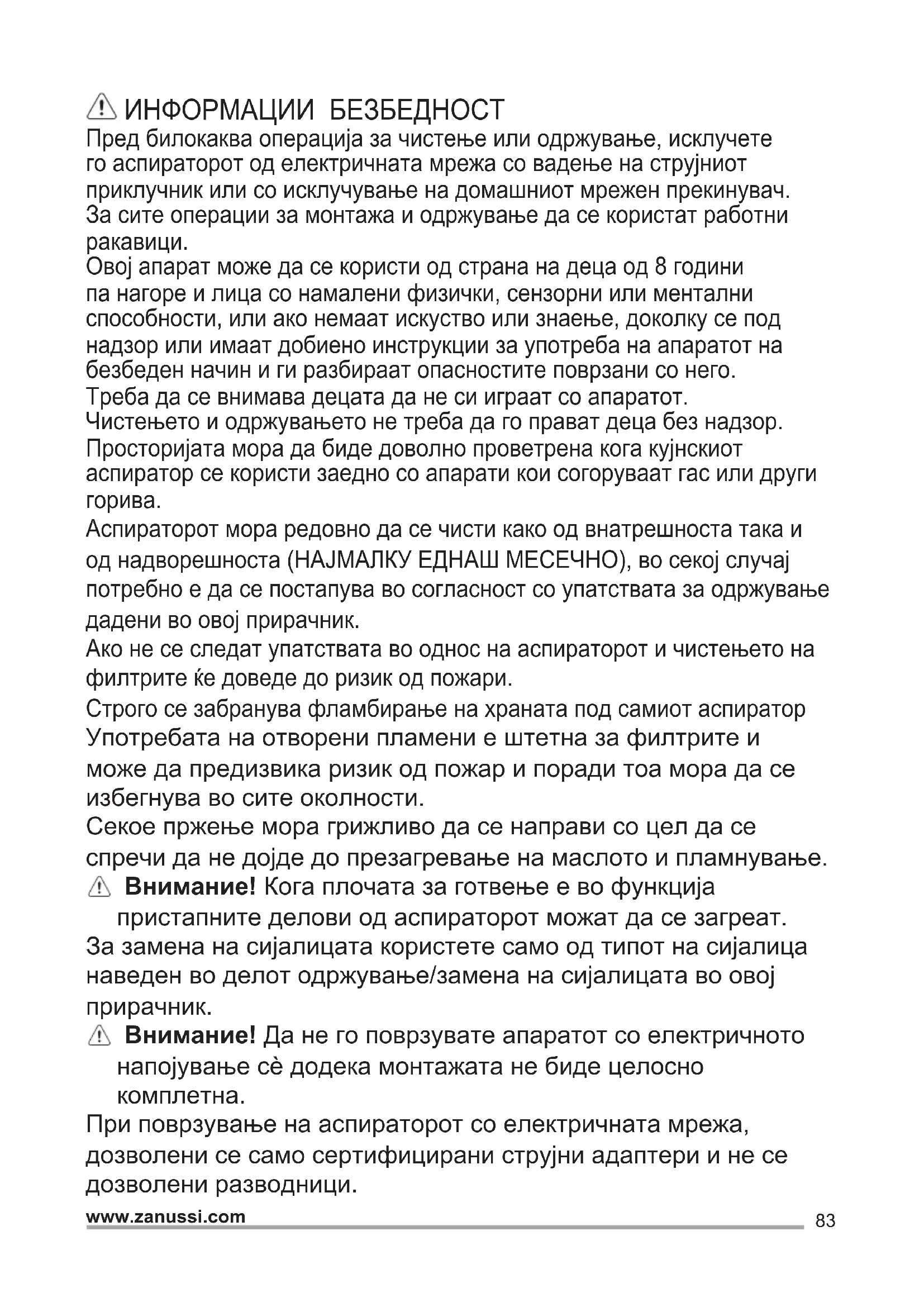 При поврзување на аспираторот со електричната мрежа, дозволени се само сертифицирани струјни адаптери и не се дозволени разводници.84 www.zanussi.com ИНСТРУКЦИИ ЗА БЕЗБЕДНОСТ Што се однесува до техничките и безбедносните мерки за примена за исфрлање на пареа важно е внимателно да се следат правилата дадени од локалните надлежни власти. Издувниот воздух не смее да се предава во активен оџак за чад створен од апарати кои согоруваат гас или други горива. Да не го користите или оставате аспираторот без правилно монтирани сијалици поради можниот ризик од електричен удар. Никогаш не користете го аспираторот ако ја немате правилно монтирано решетката! Аспираторот НИКОГАШ не смее да се користи како површина за поддршка доколку не е прецизно наведено. Користете ги само завртките за прицврстување обезбедени со производот за монтирање или ако не се обезбедени набавете го точниот тип на завртки. Користете ја точната должина за завртките што се наведени во Упатството за монтирање. Во случај на сомневање, консултирајте се со овластениот центар за техничка поддршка или персонал со слични квалификации. ВНИМАНИЕ! Немонтирањето на завртки и уреди за прицврстување во согласност со овие упатства може да доведе до опасности од електрична природа. EКОЛОШКА ПРАШАЊА Рециклирајте ги материјалите со симболот . Ставете ја амбалажата во соодветни контејнери за да ја рециклирате. Помогнете во заштитата на живтната средина и човековото здравје и рециклирајте го отпадот од електрични и електронски апарати. Не фрлајте ги апаратите озанчени со симболот во отпадот од домаќинството. Вратете го производот во вашиот локален капацитет за рециклирање или контактирајте ја вашата општинска канцеларија.
