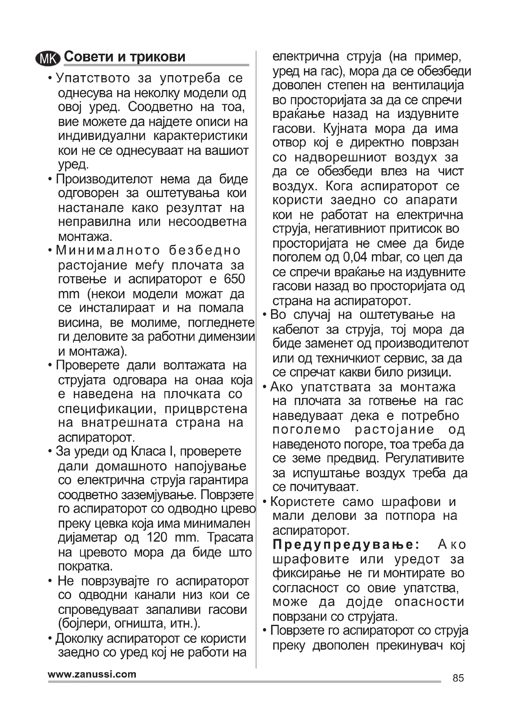 - Поврзете го аспираторот со струја преку двополен прекинувач кој MK86 www.zanussi.com има контактен јаз од најмалку 3 mm.