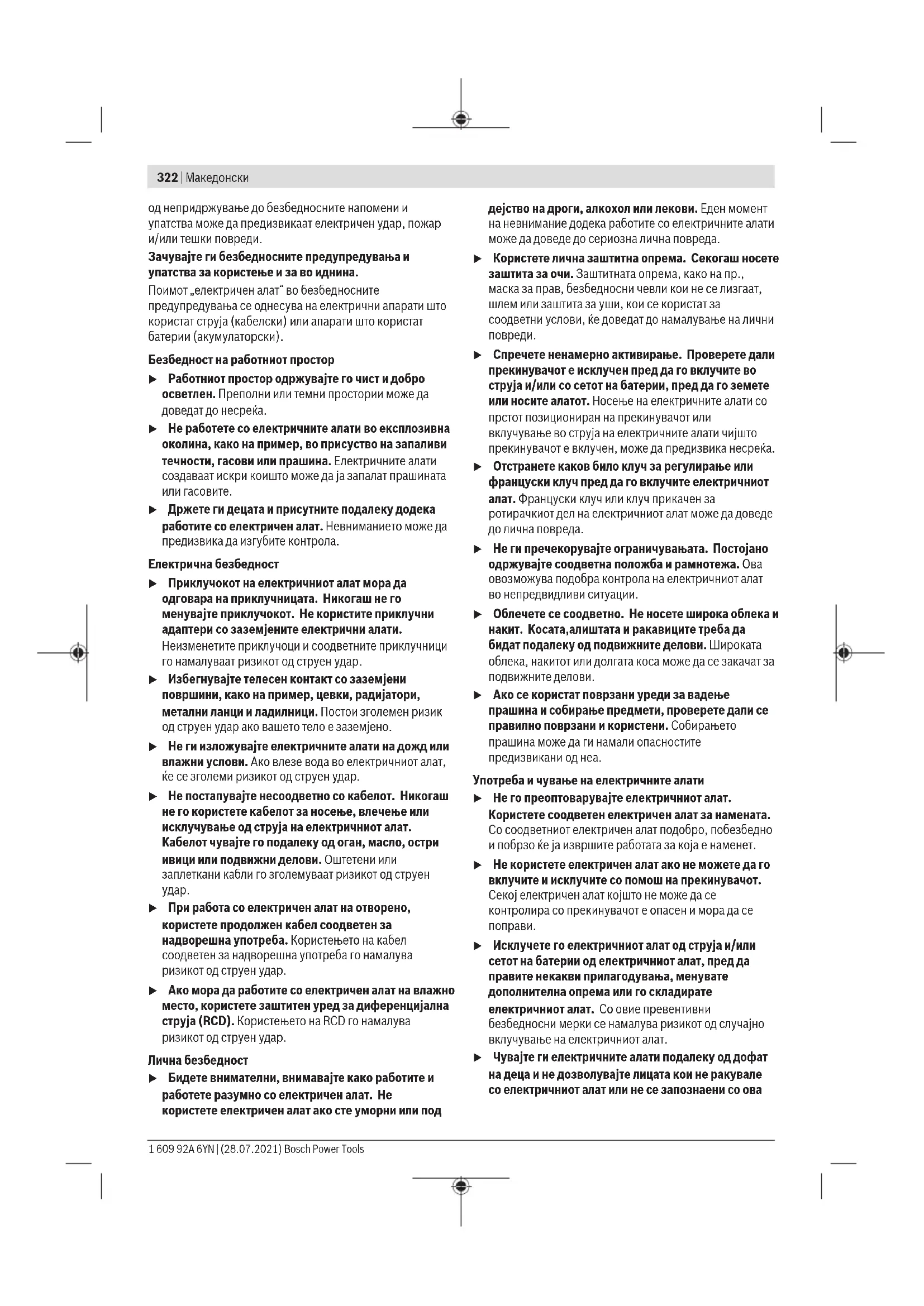 Прочитајте ги сите напомени и упатства за безбедност. Грешките настанати како резултат Bosch Power Tools 1 609 92A 6YN | (28.07.2021)322 | Македонски од непридржување до безбедносните напомени и упатства може да предизвикаат електричен удар, пожар и/или тешки повреди. Зачувајте ги безбедносните предупредувања и упатства за користење и за во иднина. Поимот „електричен алат“ во безбедносните предупредувања се однесува на електрични апарати што користат струја (кабелски) или апарати што користат батерии (акумулаторски). Безбедност на работниот простор u Работниот простор одржувајте го чист и добро осветлен. Преполни или темни простории може да доведат до несреќа. u Не работете со електричните алати во експлозивна околина, како на пример, во присуство на запаливи течности, гасови или прашина. Електричните алати создаваат искри коишто може да ја запалат прашината или гасовите. u Држете ги децата и присутните подалеку додека работите со електричен алат. Невниманието може да предизвика да изгубите контрола. Електрична безбедност u Приклучокот на електричниот алат мора да одговара на приклучницата. Никогаш не го менувајте приклучокот. Не користите приклучни адаптери со заземјените електрични алати. Неизменетите приклучоци и соодветните приклучници го намалуваат ризикот од струен удар. u Избегнувајте телесен контакт со заземјени површини, како на пример, цевки, радијатори, метални ланци и ладилници. Постои зголемен ризик од струен удар ако вашето тело е заземјено. u Не ги изложувајте електричните алати на дожд или влажни услови. Ако влезе вода во електричниот алат, ќе се зголеми ризикот од струен удар. u Не постапувајте несоодветно со кабелот. Никогаш не го користете кабелот за носење, влечење или исклучување од струја на електричниот алат. Кабелот чувајте го подалеку од оган, масло, остри ивици или подвижни делови. Оштетени или заплеткани кабли го зголемуваат ризикот од струен