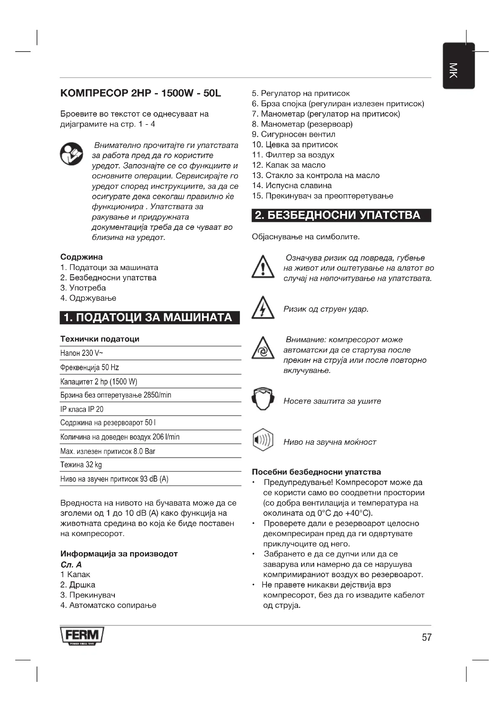 Напон 230 V~ Фреквенција 50 Hz Капацитет 2 hp (1500 W) Брзина без оптеретување 2850/min IP класа IP 20 Содржина на резервоарот 50 l Количина на доведен воздух 206 l/min Max. излезен притисок 8.0 Bar Тежина 32 kg Ниво на звучен притисок 93 dB (A) Вредноста на нивото на бучавата може да се зголеми од 1 до 10 dB (A) како функција на животната средина во која ќе биде поставен на компресорот.