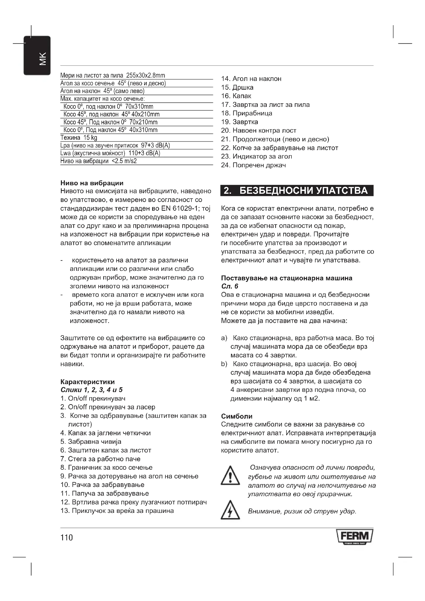 Следните симболи се важни за ракување со електричниот алат. Исправната интерпретација на симболите ви помага многу посигурно да го користите алатот. Означува опасност од лични повреди, губење на живот или оштетување на алатот во случај на непочитување на упатствата во овој прирачник. Внимание, ризик од струен удар. Мери на листот за пила 255x30x2.8mm Агол за косо сечење 45º (лево и десно) Агол на наклон 45º (само лево) Max. капацитет на косо сечење: Косо 0º, под наклон 0º 70x310mm Косо 45º, под наклон 45º 40x210mm Косо 45º, Под наклон 0º 70x210mm Косо 0º, Под наклон 45º 40x310mm Тежина 15 kg Lpa (ниво на звучен притисок 97+3 dB(A) Lwa (акустична моќност) 110+3 dB(A) Ниво на вибрации <2.5 m/s2 Ниво на вибрации Нивото на емисијата на вибрациите, наведено во упатствово, е измерено во согласност со стандардизиран тест даден во EN 61029-1; тој може да се користи за споредување на еден алат со друг како и за прелиминарна процена на изложеност на вибрации при користење на алатот во споменатите апликации - користењето на алатот за различни апликации или со различни или слабо одржуван прибор, може значително да го зголеми нивото на изложеност - времето кога алатот е исклучен или кога работи, но не ја врши работата, може значително да го намали нивото на изложеност. Заштитете се од ефектите на вибрациите со одржување на алатот и приборот, рацете да ви бидат топли и организирајте ги работните