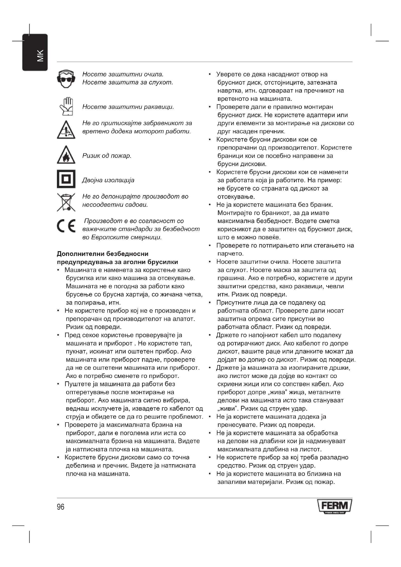 Носетезаштитниочила. Носетезаштитазаслухот. Носетезаштитниракавици. Негопритискајтезабравникотза вретенододекамоторотработи. Ризикодпожар. Двојнаизолација Негодепонирајтепроизводотво несоодветнисадови. Производотевосогласностсо важечкитестандардизабезбедност воЕвропскитесмерници. Дополнителни безбедносни предупредувања за аголни брусилки