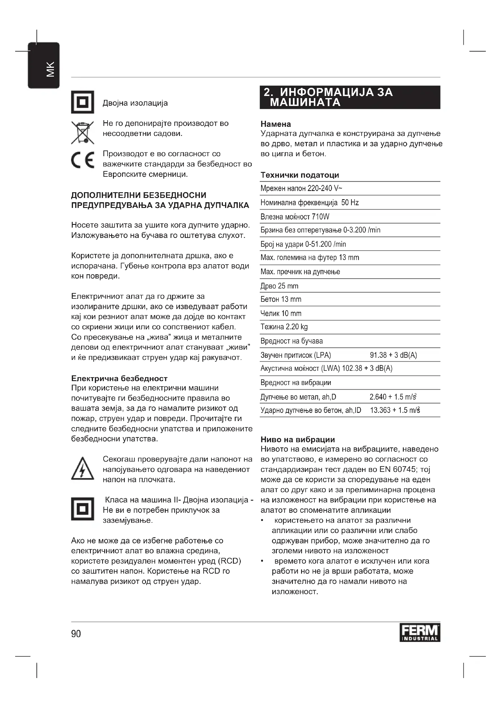 Двојна изолација Не го депонирајте производот во несоодветни садови. Производот е во согласност со важечките стандарди за безбедност во Европските смерници. ДОПОЛНИТЕЛНИ БЕЗБЕДНОСНИ ПРЕДУПРЕДУВАЊА ЗА УДАРНА ДУПЧАЛКА Носете заштита за ушите кога дупчите ударно. Изложувањето на бучава го оштетува слухот. Користете ја дополнителната дршка, ако е испорачанa. Губење контрола врз алатот води кон повреди. Електричниот алат да го држите за изолираните дршки, ако се изведуваат работи кај кои резниот алат може да дојде во контакт со скриени жици или со сопствениот кабел. Со пресекување на „жива” жица и металните делови од електричниот алат стануваат „живи” и ќе предизвикаат струен удар кај ракувачот. Електрична безбедност При користење на електрични машини почитувајте ги безбедносните правила во вашата земја, за да го намалите ризикот од пожар, струен удар и повреди. Прочитајте ги следните безбедносни упатства и приложените безбедносни упатства. Секогаш проверувајте дали напонот на напојувањето одговара на наведениот напон на плочката. Класа на машина II- Двојна изолација - Не ви е потребен приклучок за заземјување. Ако не може да се избегне работење со електричниот алат во влажна средина, користете резидуален моментен уред (RCD) со заштитен напон. Користење на RCD го намалува ризикот од струен удар.