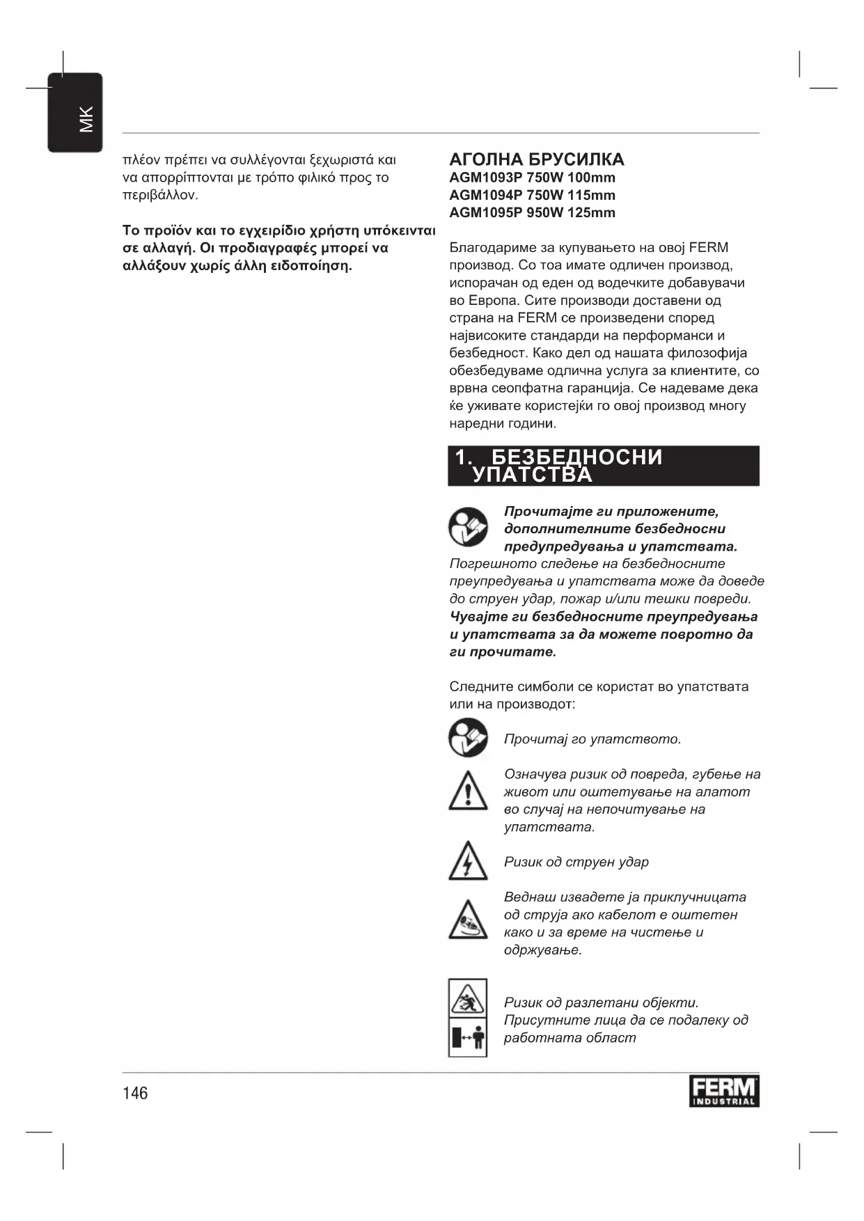 πλέον πρέπει να συλλέγονται ξεχωριστά και να απορρίπτονται με τρόπο φιλικό προς το περιβάλλον. Το προϊόν και το εγχειρίδιο χρήστη υπόκεινται σε αλλαγή. Οι προδιαγραφές μπορεί να αλλάξουν χωρίς άλλη ειδοποίηση. АГОЛНА БРУСИЛКА AGM1093P 750W 100mm AGM1094P 750W 115mm AGM1095P 950W 125mm Благодариме за купувањето на овој FERM производ. Со тоа имате одличен производ, испорачан од еден од водечките добавувачи во Европа. Сите производи доставени од страна на FERM се произведени според највисоките стандарди на перформанси и безбедност. Како дел од нашата филозофија обезбедуваме одлична услуга за клиентите, со врвна сеопфатна гаранција. Се надеваме дека ќе уживате користејќи го овој производ многу наредни години.