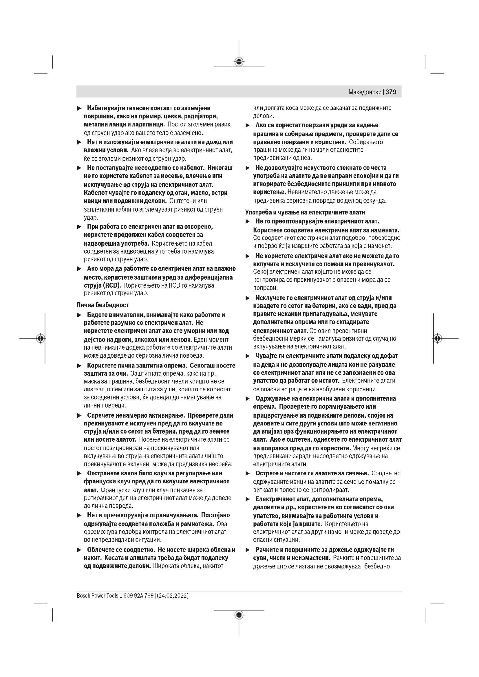 Прочитајте ги сите безбедносни предупредувања, илустрации и спецификации приложени со овој електричен алат. Непридржувањето до сите упатства приложени подолу може да доведе до струен удар, пожар и/или тешки повреди. Зачувајте ги безбедносните предупредувања и упатства за користење и за во иднина. Поимот „електричен алат“ во безбедносните предупредувања се однесува на електрични апарати што користат струја (кабелски) или апарати што користат батерии (акумулаторски). Безбедност на работниот простор u Работниот простор одржувајте го чист и добро осветлен. Преполни или темни простории може да доведат до несреќа. u Не работете со електричните алати во експлозивна околина, како на пример, во присуство на запаливи течности, гасови или прашина. Електричните алати создаваат искри коишто може да ја запалат прашината или гасовите. u Држете ги децата и присутните подалеку додека работите со електричен алат. Невниманието може да предизвика да изгубите контрола. Електрична безбедност u Приклучокот на електричниот алат мора да одговара на приклучницата. Никогаш не го менувајте приклучокот. Не користите приклучни адаптери со заземјените електрични алати. Неизменетите приклучоци и соодветните приклучници го намалуваат ризикот од струен удар. 1 609 92A 769 | (24.02.2022) Bosch Power ToolsМакедонски | 379 u Избегнувајте телесен контакт со заземјени површини, како на пример, цевки, радијатори, метални ланци и ладилници. Постои зголемен ризик од струен удар ако вашето тело е заземјено. u Не ги изложувајте електричните алати на дожд или влажни услови. Ако влезе вода во електричниот алат, ќе се зголеми ризикот од струен удар. u Не постапувајте несоодветно со кабелот. Никогаш не го користете кабелот за носење, влечење или исклучување од струја на електричниот алат. Кабелот чувајте го подалеку од оган, масло, остри ивици или подвижни делови. Оштетени или заплеткани кабли го зголемуваат ризикот од струен