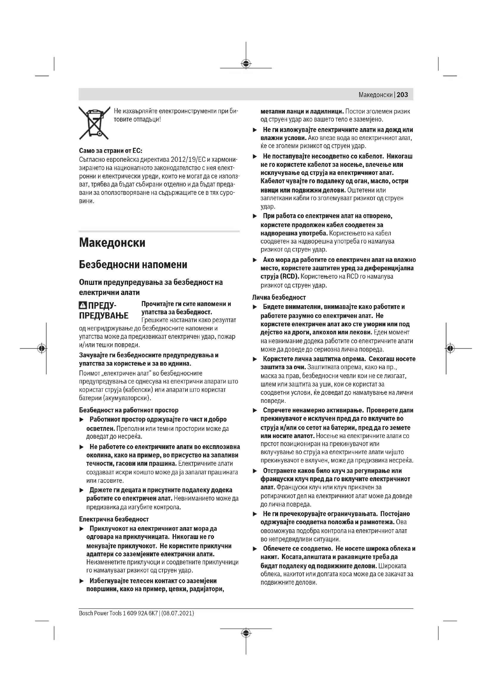 Прочитајте ги сите напомени и упатства за безбедност. Грешките настанати како резултат од непридржување до безбедносните напомени и упатства може да предизвикаат електричен удар, пожар и/или тешки повреди. Зачувајте ги безбедносните предупредувања и упатства за користење и за во иднина. Поимот „електричен алат“ во безбедносните предупредувања се однесува на електрични апарати што користат струја (кабелски) или апарати што користат батерии (акумулаторски). Безбедност на работниот простор u Работниот простор одржувајте го чист и добро осветлен. Преполни или темни простории може да доведат до несреќа. u Не работете со електричните алати во експлозивна околина, како на пример, во присуство на запаливи течности, гасови или прашина. Електричните алати создаваат искри коишто може да ја запалат прашината или гасовите. u Држете ги децата и присутните подалеку додека работите со електричен алат. Невниманието може да предизвика да изгубите контрола. Електрична безбедност u Приклучокот на електричниот алат мора да одговара на приклучницата. Никогаш не го менувајте приклучокот. Не користите приклучни адаптери со заземјените електрични алати. Неизменетите приклучоци и соодветните приклучници го намалуваат ризикот од струен удар. u Избегнувајте телесен контакт со заземјени површини, како на пример, цевки, радијатори, метални ланци и ладилници. Постои зголемен ризик од струен удар ако вашето тело е заземјено. u Не ги изложувајте електричните алати на дожд или влажни услови. Ако влезе вода во електричниот алат, ќе се зголеми ризикот од струен удар. u Не постапувајте несоодветно со кабелот. Никогаш не го користете кабелот за носење, влечење или исклучување од струја на електричниот алат. Кабелот чувајте го подалеку од оган, масло, остри ивици или подвижни делови. Оштетени или заплеткани кабли го зголемуваат ризикот од струен