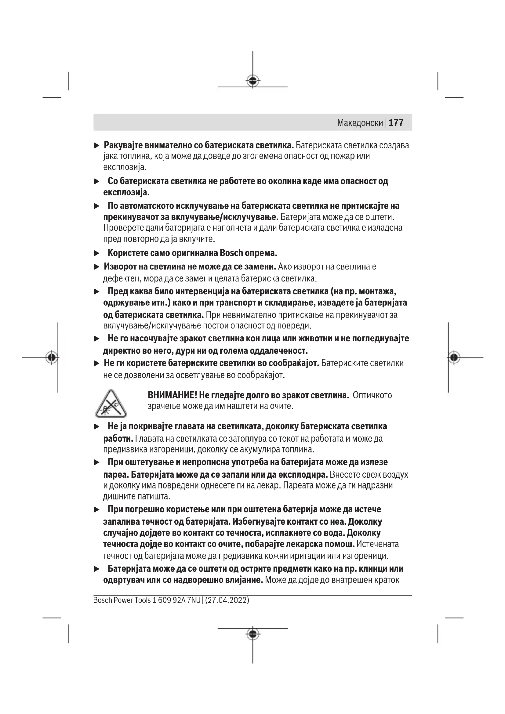 Безбедносни напомени Безбедносни напомени за батериската светилка Прочитајте ги сите безбедносни напомени и упатства. Грешките настанати како резултат од непридржување до безбедносните напомени и упатства може да предизвикаат електричен удар, пожар и/или тешки повреди. Чувајте ги безбедносните напомени и упатства за користење и за во иднина. 1 609 92A 7NU | (27.04.2022) Bosch Power ToolsМакедонски | 177 u Ракувајте внимателно со батериската светилка. Батериската светилка создава јака топлина, која може да доведе до зголемена опасност од пожар или експлозија. u Со батериската светилка не работете во околина каде има опасност од експлозија. u По автоматското исклучување на батериската светилка не притискајте на прекинувачот за вклучување/исклучување. Батеријата може да се оштети. Проверете дали батеријата е наполнета и дали батериската светилка е изладена пред повторно да ја вклучите. u Користете само оригинална Bosch опрема. u Изворот на светлина не може да се замени. Ако изворот на светлина е дефектен, мора да се замени целата батериска светилка. u Пред каква било интервенција на батериската светилка (на пр. монтажа, одржување итн.) како и при транспорт и складирање, извадете ја батеријата од батериската светилка. При невнимателно притискање на прекинувачот за вклучување/исклучување постои опасност од повреди. u Не го насочувајте зракот светлина кон лица или животни и не погледнувајте директно во него, дури ни од голема оддалеченост. u Не ги користете батериските светилки во сообраќајот. Батериските светилки не се дозволени за осветлување во сообраќајот. ВНИМАНИЕ! Не гледајте долго во зракот светлина. Оптичкото зрачење може да им наштети на очите. u Не ја покривајте главата на светилката, доколку батериската светилка работи. Главата на светилката се затоплува со текот на работата и може да предизвика изгореници, доколку се акумулира топлина. u При оштетување и непрописна употреба на батеријата може да излезе пареа. Батеријата може да се запали или да експлодира. Внесете свеж воздух и доколку има повредени однесете ги на лекар. Пареата може да ги надразни дишните патишта. u При погрешно користење или при оштетена батерија може да истече запалива течност од батеријата. Избегнувајте контакт со неа. Доколку случајно дојдете во контакт со течноста, исплакнете со вода. Доколку течноста дојде во контакт со очите, побарајте лекарска помош. Истечената течност од батеријата може да предизвика кожни иритации или изгореници. u Батеријата може да се оштети од острите предмети како на пр. клинци или одвртувач или со надворешно влијание. Може да дојде до внатрешен краток Bosch Power Tools 1 609 92A 7NU | (27.04.2022)178 | Македонски спој и батеријата може да се запали, да пушти чад, да експлодира или да се