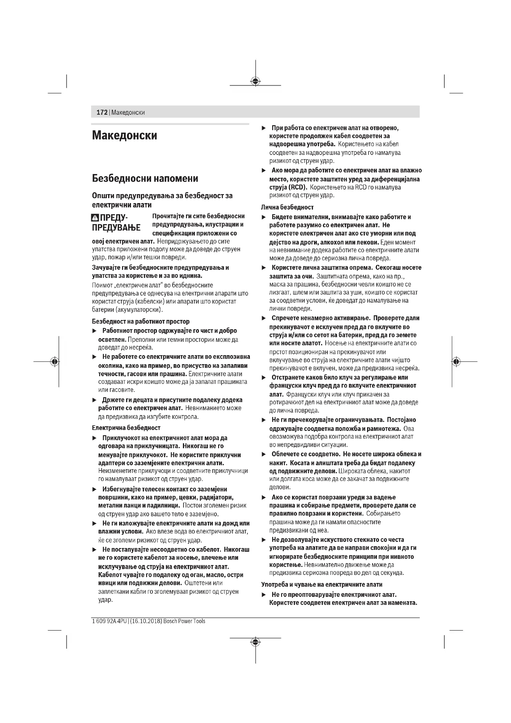 Прочитајте ги сите безбедносни предупредувања, илустрации и спецификации приложени со овој електричен алат. Непридржувањето до сите упатства приложени подолу може да доведе до струен удар, пожар и/или тешки повреди. Зачувајте ги безбедносните предупредувања и упатства за користење и за во иднина. Поимот „електричен алат“ во безбедносните предупредувања се однесува на електрични апарати што користат струја (кабелски) или апарати што користат батерии (акумулаторски). Безбедност на работниот простор u Работниот простор одржувајте го чист и добро осветлен. Преполни или темни простории може да доведат до несреќа. u Не работете со електричните алати во експлозивна околина, како на пример, во присуство на запаливи течности, гасови или прашина. Електричните алати создаваат искри коишто може да ја запалат прашината или гасовите. u Држете ги децата и присутните подалеку додека работите со електричен алат. Невниманието може да предизвика да изгубите контрола. Електрична безбедност u Приклучокот на електричниот алат мора да одговара на приклучницата. Никогаш не го менувајте приклучокот. Не користите приклучни адаптери со заземјените електрични алати. Неизменетите приклучоци и соодветните приклучници го намалуваат ризикот од струен удар. u Избегнувајте телесен контакт со заземјени површини, како на пример, цевки, радијатори, метални ланци и ладилници. Постои зголемен ризик од струен удар ако вашето тело е заземјено. u Не ги изложувајте електричните алати на дожд или влажни услови. Ако влезе вода во електричниот алат, ќе се зголеми ризикот од струен удар. u Не постапувајте несоодветно со кабелот. Никогаш не го користете кабелот за носење, влечење или исклучување од струја на електричниот алат. Кабелот чувајте го подалеку од оган, масло, остри ивици или подвижни делови. Оштетени или заплеткани кабли го зголемуваат ризикот од струен