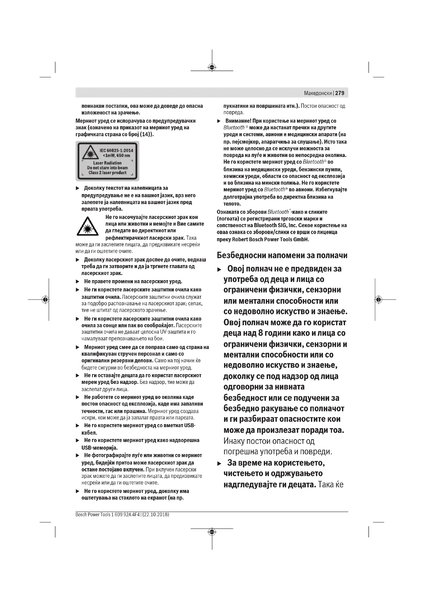 Притиснете на копчето (4)[+]. Пресметаната површина и ознаката „+“ ќе се прикажат. Притиснете го мерното копче (2) [ ], за да стартувате друго мерење на површината. Утврдете ја површината како што е опишано во делот „Мерење на површина“ (види „Мерење на површини“, Страница285). Штом ќе заврши второто мерење, долу на екранот ќе се прикаже резултатот од второто мерење на површини. За да го прикажете крајниот резултат, притиснете одново на мерното копче (2) [ ]. Напомена: При мерење на должини веднаш се прикажува крајниот резултат. Одземање на вредности За одземање на вредности притиснете на копчето (11) [–]. Понатамошната постапка е слична на „Додавање на вредности“. Бришење на измерените вредности Со кратко притискање на копчето за вклучување- исклучување-бришење (9) [ ] можете да ги избришете последно добиените поединечни измерени вредности во сите мерни функции. Bluetooth ®-интерфејс Пренос на податоци на други уреди Мерниот уред има Bluetooth®-модул, којшто со безжична технологија овозможува пренос на податоци до одредени мобилни уреди со Bluetooth®-интерфејс (на пр. паметен телефон, таблет). Информации за потребните системски предуслови за Bluetooth®-врска ќе најдете на интернет страната на Bosch на www.bosch-pt.com u Дополнителни информации ќе најдете на страницата за производи на Bosch. При пренос на податоци со помош на Bluetooth® може да настанат временски одложувања помеѓу мобилниот уред Македонски | 287 Bosch Power Tools 1 609 92A 4F4 | (22.10.2018)288 | Македонски 1 609 92A 4F4 | (22.10.2018) Bosch Power Tools и мерниот уред. Ова може да се случи поради оддалеченоста на двата уреди или самиот мерен објект. Активирање на Bluetooth ®- интерфејс за пренос на податоци на мобилен уред Активирањето на Bluetooth®-интерфејсот се прави во поставките. За активирање на Bluetooth®-сигналот притиснете го копчето (4)[+]. Проверете дали Bluetooth®- интерфејсот е активиран на Вашиот мобилен уред. За надградба на обемот на функции на мобилниот краен уред и за поедноставување на обработката на податоци ја имате на располагање специјалната Bosch-апликација (App) „Measuring Master“. Тие може да се преземат во соодветните продавници во зависност од уредот. По старт на Bosch-апликацијата се воспоставува врска помеѓу мобилниот уред и мерниот уред. Доколку се пронајдени повеќе активни мерни уреди, изберете го соодветниот мерен уред со помош на серискиот број. Серискиот број (15) ќе го најдете на спецификационата плочка на Вашиот мерен уред. Статусот на поврзување како и активната врска (f) се прикажуваат на екранот (1) на мерниот уред. Деактивирање на Bluetooth ®-интерфејс Деактивирањето на Bluetooth®-врската се прави во поставките. За деактивирање на Bluetooth®-сигналот притиснете го копчето (11)[–] или исклучете го мерниот