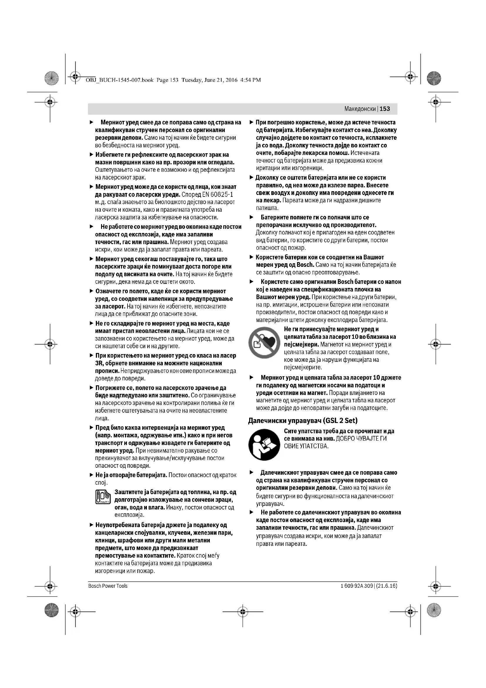 Внимание – доколку користите други уреди за подесување и ракување освен овде наведените или поинакви постапки, ова може да доведе до опасна изложеност на зрачење. Мерниот уред се испорачува со две ознаки за предупредување (на приказот на мерниот уред на графичката страница означени со број 2). Доколку текстот на ознаките за предупредување не е на Вашиот јазик, пред првата употреба прелепете го со испорачаните налепници на Вашиот јазик. Не го насочувајте ласерскиот зрак на лица или животни и не погледнувајте во него. Ово ј мерен уред создава ласерски зраци од класата 3R според IEC60825-1. Директен поглед во ласерскиот зрак – и од голема оддалеченост – може да ги оштети очите. Доколку ласерскиот зрак доспее до очите, веднаш треба да ги затворите и да ја тргнете главата од ласерскиот зрак. Не ги користете ласерските очила како заштитни очила. Ласерските очила служат за подобро препознавање на ласерскиот зрак, но не заштитуваат од ласерското зрачење. Не ги користете ласерските очила како очила за сонце или пак во сообраќајот. Ласерските очила не даваат целосна UV-заштита и го намалуваат препознавањето на бои. Не вршете никакви промени на ласерскиот уред. OBJ_BUCH-1545-007.book Page 152 Tuesday, June 21, 2016 4:54 PMМакедонски | 153 Bosch Power Tools 1 609 92A 309 | (21.6.16) Мерниот уред смее да се поправа само од страна на квалификуван стручен персонал со оригинални резервни делови. Само на тој начин ќе бидете сигурни во безбедноста на мерниот уред. Избегнете ги рефлексиите од ласерскиот зрак на мазни површини како на пр. прозори или огледала. Оштетувањето на очите е возможно и од рефлексијата на ласерскиот зрак. Мерниот уред може да се користи од лица, кои знаат да ракуваат со ласерски уреди. Според EN 60825-1 м.д. спаѓа знаењето за биолошкото дејство на ласерот на очите и кожата, како и правилната употреба на ласерска заштита за избегнување на опасности. Не работете со мерниот уред во околина каде постои опасност од експлозија, каде има запаливи течности, гас или прашина. Мерниот уред создава искри, кои може да ја запалат правта или пареата. Мерниот уред секогаш поставувајте го, така што ласерските зраци ќе поминуваат доста погоре или подолу од висината на очите. На тој начин ќе бидете сигурни, дека нема да се оштети окото. Означете го полето, каде ќе се користи мерниот уред, со соодветни налепници за предупредувањ