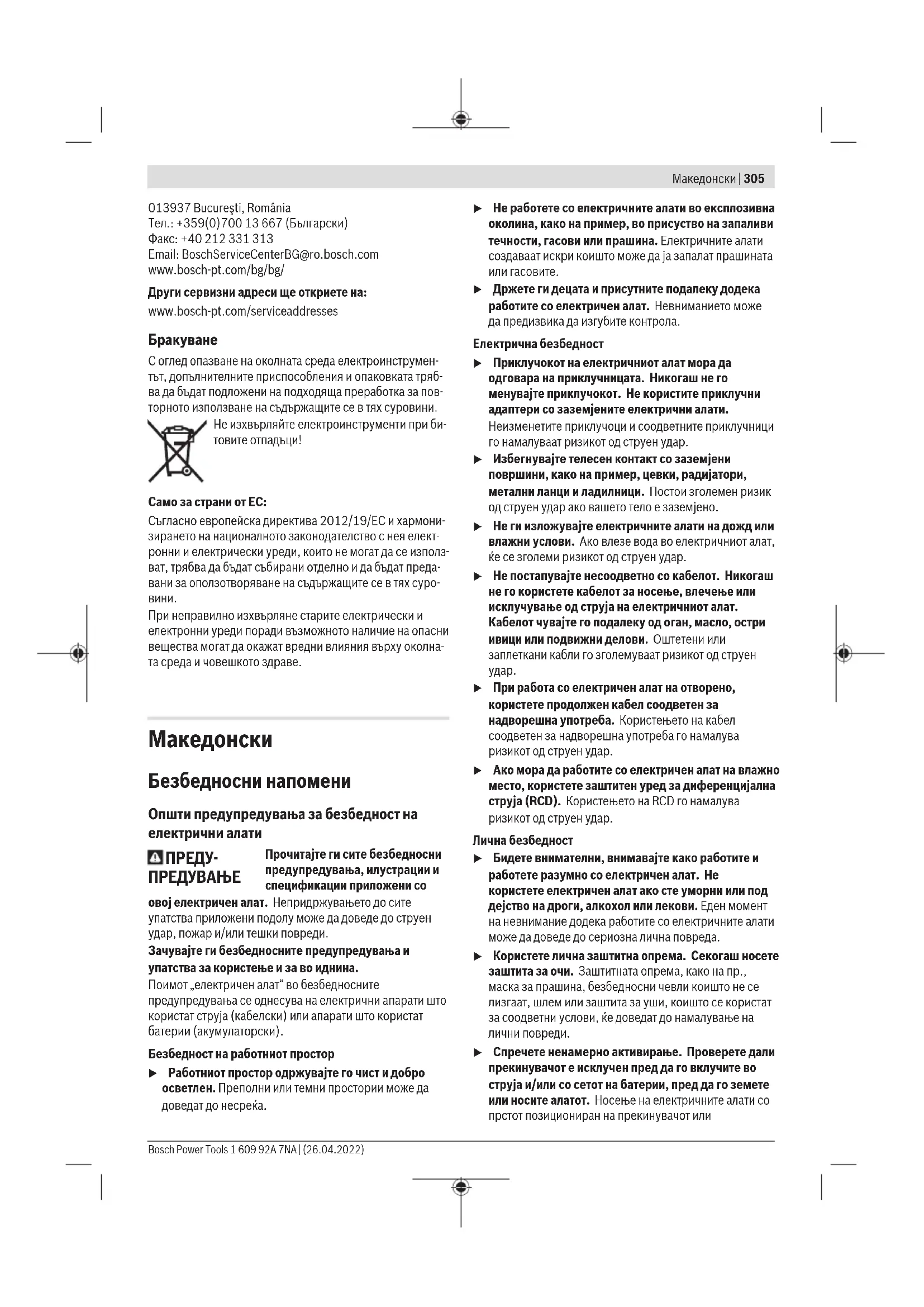 u При работа со електричен алат на отворено, користете продолжен кабел соодветен за надворешна употреба. Користењето на кабел соодветен за надворешна употреба го намалува ризикот од струен удар. u Ако мора да работите со електричен алат на влажно место, користете заштитен уред за диференцијална струја (RCD). Користењето на RCD го намалува ризикот од струен удар. Лична безбедност u Бидете внимателни, внимавајте како работите и работете разумно со електричен алат. Не користете електричен алат ако сте уморни или под дејство на дроги, алкохол или лекови. Еден момент на невнимание додека работите со електричните алати може да доведе до сериозна лична повреда. u Користете лична заштитна опрема. Секогаш носете заштита за очи. Заштитната опрема, како на пр., маска за прашина, безбедносни чевли коишто не се лизгаат, шлем или заштита за уши, коишто се користат за соодветни услови, ќе доведат до намалување на лични повреди. u Спречете ненамерно активирање. Проверете дали прекинувачот е исклучен пред да го вклучите во струја и/или со сетот на батерии, пред да го земете или носите алатот. Носење на електричните алати со прстот позициониран на прекинувачот или Bosch Power Tools 1 609 92A 7NA | (26.04.2022)306 | Македонски вклучување во струја на електричните алати чијшто прекинувачот е вклучен, може да предизвика несреќа. u Отстранете каков било клуч за регулирање или француски клуч пред да го вклучите електричниот алат. Француски клуч или клуч прикачен за ротирачкиот дел на електричниот алат може да доведе до лична повреда. u Не ги пречекорувајте ограничувањата. Постојано одржувајте соодветна положба и рамнотежа. Ова овозможува подобра контрола на електричниот алат во непредвидливи ситуации. u Облечете се соодветно. Не носете широка облека и накит. Косата и алиштата треба да бидат подалеку од подвижните делови. Широката облека, накитот или долгата коса може да се закачат за подвижните