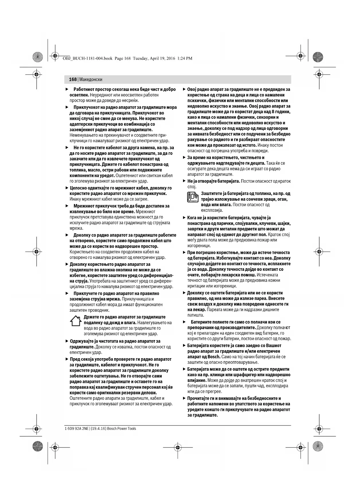 Причина Отстраняване ПРЕДУПРЕДУВАЊЕ OBJ_BUCH-1181-004.book Page 167 Tuesday, April 19, 2016 1:24 PM168 | Македонски 1 609 92A 2NE | (19.4.16) Bosch Power Tools Работниот простор секогаш нека биде чист и добро осветлен. Неуредниот или неосветлен работен простор може да доведе до несреќи. Приклучокот на радио апаратот за градилиште мора да одговара на приклучницата. Приклучокот во никој случај не смее да се менува. Не користете адаптерски приклучоци во комбинација со заземјениот радио апарат за градилиште. Неменувањето на прекинувачот и соодветните при- клучници го намалуваат ризикот од електричен удар. Не го користите кабелот за друга намена, на пр. за да го носите радио апаратот за градилиште, за да го закачите или да го извлечете приклучокот од приклучницата. Држете го кабелот понастрана од топлина, масло, остри рабови или подвижните компоненти на уредот. Оштетениот или свиткан кабел го зголемува ризикот за електричен удар. Целосно одвиткајте го мрежниот кабел, доколку го користите радио апаратот со мрежен приклучок. Инаку мрежниот кабел може да се загрее. Мрежниот приклучок треба да биде достапен за извлекување во било кое време. Мрежниот приклучок претставува единствена можност да го исклучите радио апаратот за градилиште од струјната