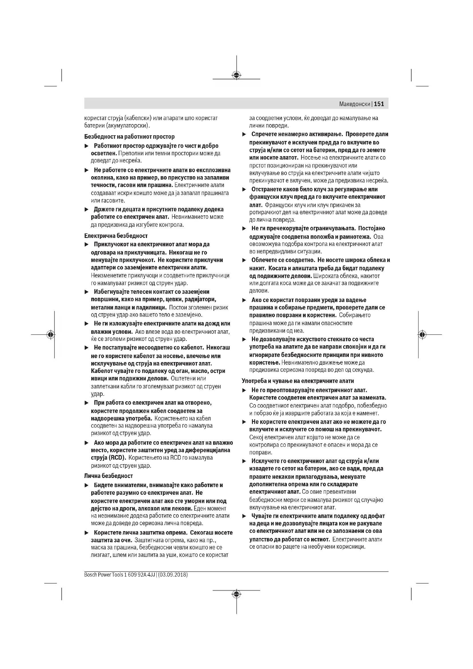 u Исклучете го електричниот алат од струја и/или извадете го сетот на батерии, ако се вади, пред да правите некакви прилагодувања, менувате дополнителна опрема или го складирате електричниот алат. Со овие превентивни безбедносни мерки се намалува ризикот од случајно вклучување на електричниот алат. u Чувајте ги електричните алати подалеку од дофат на деца и не дозволувајте лицата кои не ракувале со електричниот алат или не се запознаени со ова упатство да работат со истиот. Електричните алати се опасни во рацете на необучени корисници. Македонски | 151 Bosch Power Tools 1 609 92A 4JJ | (03.09.2018)152 | Македонски 1 609 92A 4JJ | (03.09.2018) Bosch Power Tools u Одржување на електрични алати и дополнителна опрема. Проверете го порамнувањето или прицврстување на подвижните делови, спојот на деловите и сите други услови што може негативно да влијаат врз функционирањето на електричниот алат. Ако е оштетен, однесете го електричниот алат на поправка пред да го користите. Многу несреќи се предизвикани заради несоодветно одржување на електричните алати. u Острете и чистете ги алатите за сечење. Соодветно одржуваните ивици на алатите за сечење помалку се виткаат и полесно се контролираат. u Електричниот алат, дополнителната опрема, деловите и др., користете ги во согласност со ова упатство, внимавајте на работните услови и работата која ја вршите. Користењето на електричниот алат за други намени може да доведе до опасни ситуации. u Рачките и површините за држење одржувајте ги суви, чисти и неизмастени. Рачките и површините за држење што се лизгаат не овозможуваат безбедно ракување и контрола на алатот во непредвидливи