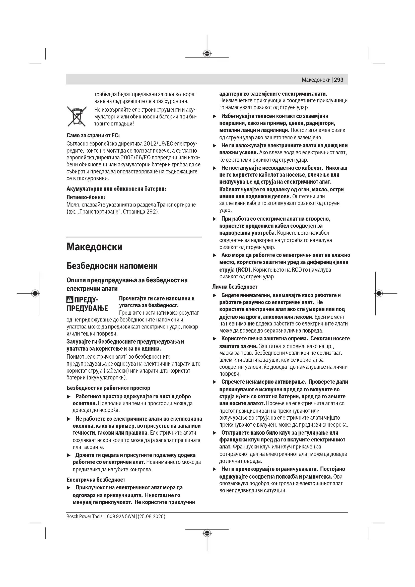 Прочитајте ги сите напомени и упатства за безбедност. Грешките настанати како резултат од непридржување до безбедносните напомени и упатства може да предизвикаат електричен удар, пожар и/или тешки повреди. Зачувајте ги безбедносните предупредувања и упатства за користење и за во иднина. Поимот „електричен алат“ во безбедносните предупредувања се однесува на електрични апарати што користат струја (кабелски) или апарати што користат батерии (акумулаторски). Безбедност на работниот простор u Работниот простор одржувајте го чист и добро осветлен. Преполни или темни простории може да доведат до несреќа. u Не работете со електричните алати во експлозивна околина, како на пример, во присуство на запаливи течности, гасови или прашина. Електричните алати создаваат искри коишто може да ја запалат прашината или гасовите. u Држете ги децата и присутните подалеку додека работите со електричен алат. Невниманието може да предизвика да изгубите контрола. Електрична безбедност u Приклучокот на електричниот алат мора да одговара на приклучницата. Никогаш не го менувајте приклучокот. Не користите приклучни адаптери со заземјените електрични алати. Неизменетите приклучоци и соодветните приклучници го намалуваат ризикот од струен удар. u Избегнувајте телесен контакт со заземјени површини, како на пример, цевки, радијатори, метални ланци и ладилници. Постои зголемен ризик од струен удар ако вашето тело е заземјено. u Не ги изложувајте електричните алати на дожд или влажни услови. Ако влезе вода во електричниот алат, ќе се зголеми ризикот од струен удар. u Не постапувајте несоодветно со кабелот. Никогаш не го користете кабелот за носење, влечење или исклучување од струја на електричниот алат. Кабелот чувајте го подалеку од оган, масло, остри ивици или подвижни делови. Оштетени или заплеткани кабли го зголемуваат ризикот од струен