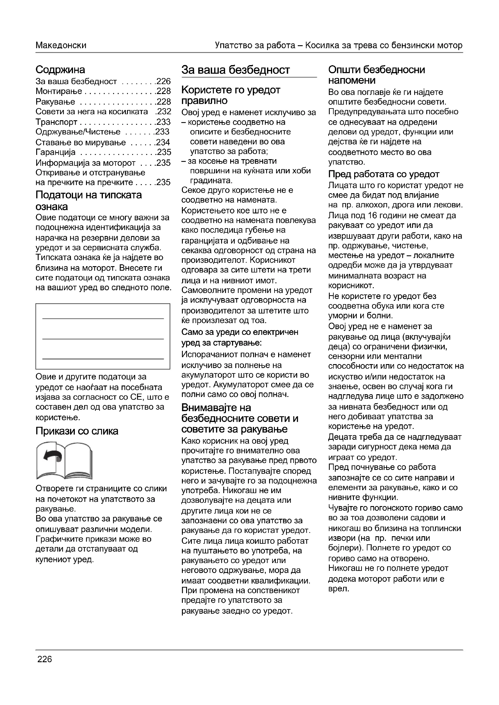 Секое друго користење не е соодветно на намената. Kористењето кое што не е соодветно на намената повлекува како последица губење на гаранциjата и одбивање на секаква одговорност од страна на производителот. Kорисникот одговара за сите штети на трети лица и на нивниот имот. Самоволните промени на уредот jа исклучуваат одговорноста на производителот за штетите што ќе произлезат од тоа. Само за уреди со електричен уред за стартување: Испорачаниот полнач е наменет исклучиво за полнење на акумулаторот што се користи во уредот. Акумулаторот смее да се полни само со овоj полнач. Внимавајте на безбедносните совети и советите за ракување Kако корисник на овоj уред прочитаjте го внимателно ова упатство за ракување пред првото користење. Постапуваjте според него и зачуваjте го за подоцнежна употреба. Hикогаш не им дозволуваjте на децата или другите лица кои не се запознаени со ова упатство за ракување да го користат уредот. Сите лица лица коишто работат на пуштањето во употреба, на ракувањето со уредот или неговото одржување, мора да имаат соодветни квалификации. При промена на сопственикот предаjте го упатството за ракување заедно со уредот. Општи безбедносни