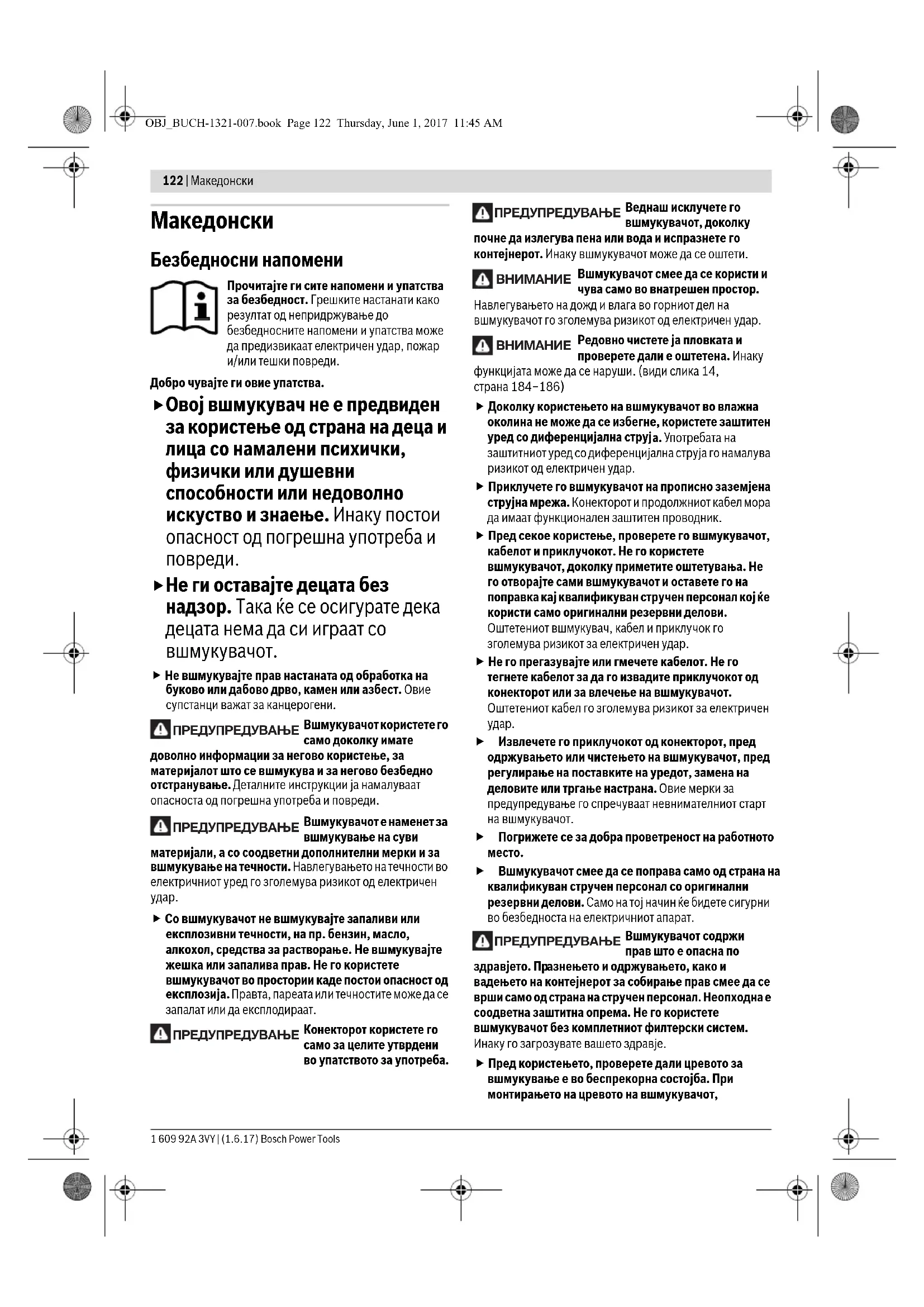 ПРЕДУПРЕДУВАЊЕ OBJ_BUCH-1321-007.book Page 122 Thursday, June 1, 2017 11:45 AMМакедонски | 123 Bosch Power Tools 1 609 92A 3VY | (1.6.17) проверете да не излегува прав. Инаку може да ја вдишете правта. Не го користете вшмукувачот како предмет за седење. Може да го оштетите вшмукувачот. Внимателно користете го струјниот кабел и цревото за вшмукување. Внимавајте притоа да не ги доведете другите лица во опасност. Не го чистете вшмукувачот со директно насочен млаз вода. Навлегувањето на вода во горниот дел на вшмукувачот го зголемува ризикот од електричен удар. Останати напомени за безбедност и