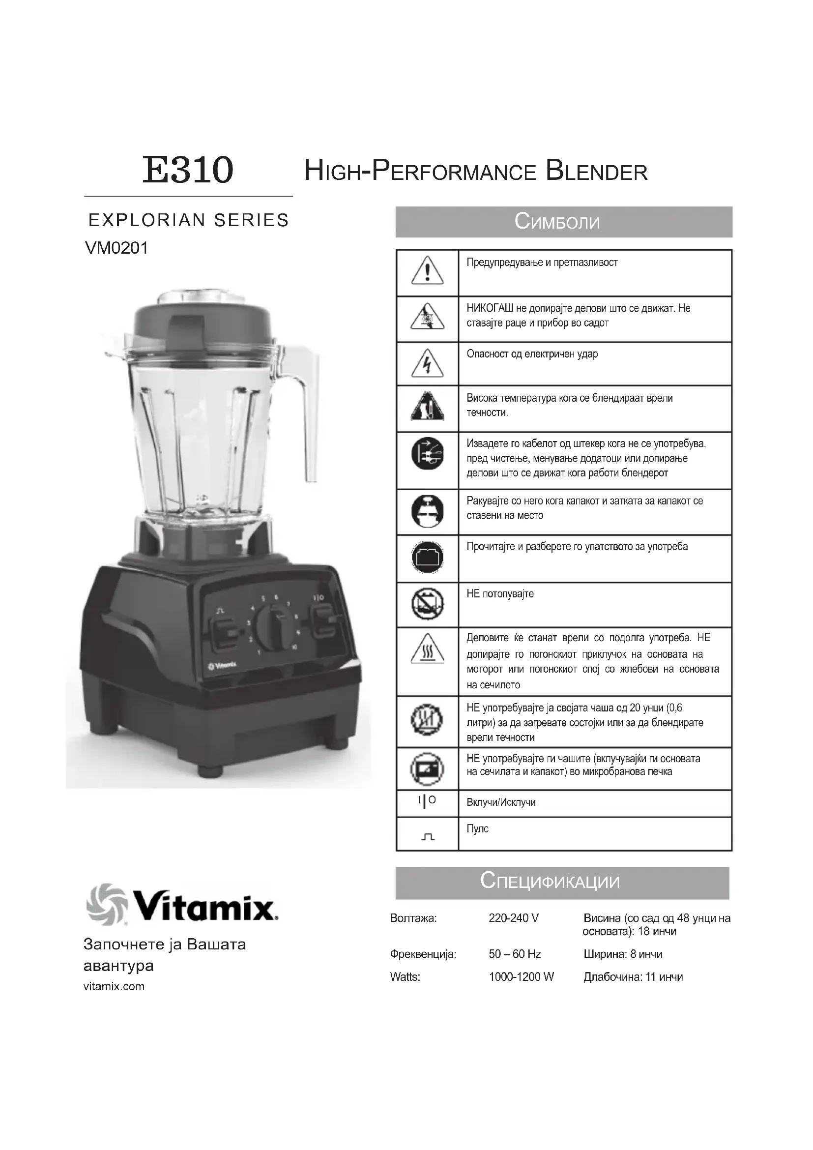 HigH-Performance Blender спецификации E310 EXPLORIAN SERIES Волтажа: 220-240 V Висина (со сад од 48 унци на основата): 18 инчи Фреквенција: 50 – 60 Hz Ширина: 8 инчи Watts: 1000-1200 W Длабочина: 11 инчи132 важни упатства за без б е д н а у п О т р е ба ПРЕДУПРЕДУВАЊЕ: За да избегнете ризик од сериозна повреда кога го употребувате блендерот Vitamix® треба да преземете основни мерки на претпазливост, вклучувајќи ги следниве . ПРОЧИТАЈТЕ ГИ СИТЕ УПАТСТВА, МЕРКИ ЗА ЗАШТИТА И ПРЕДУПРЕДУВАЊА ПРЕД ДА РАКУВАТЕ СО БЛЕНДЕРОТ.