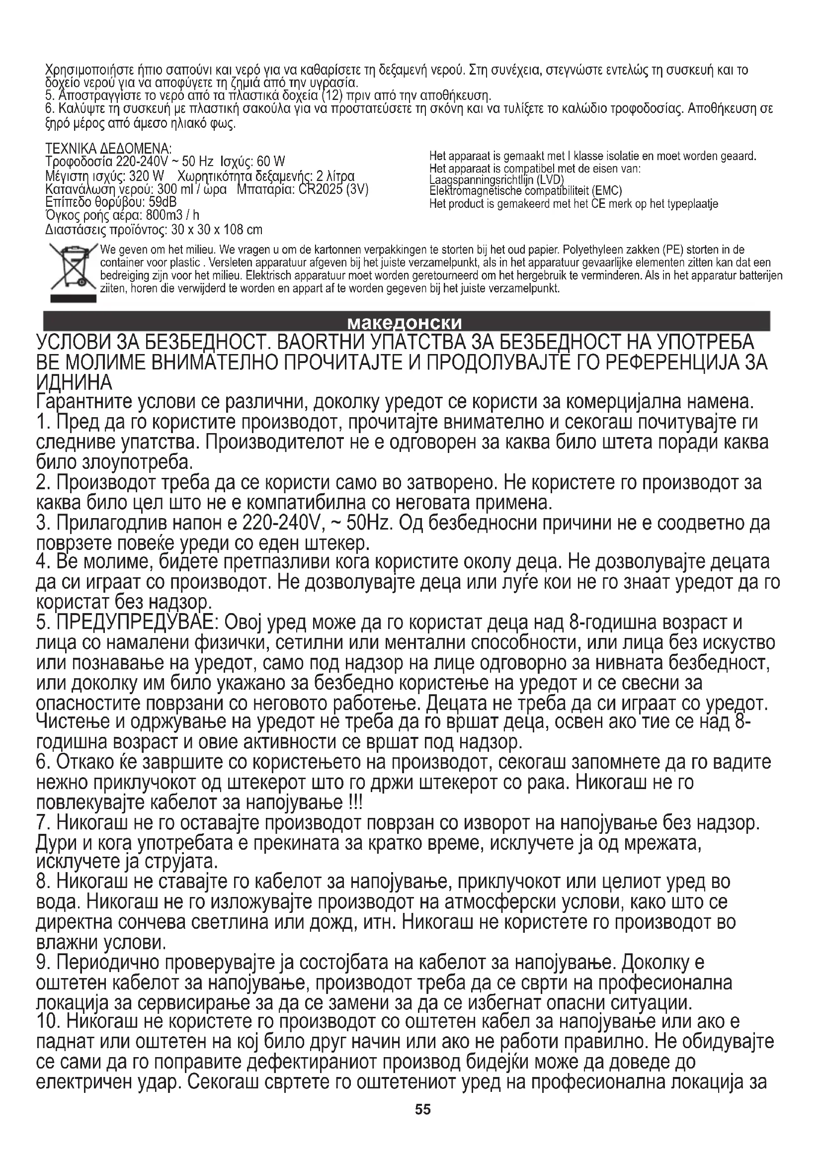 6. Покријте го уредот со пластична кеса за да ја заштитите правот и да го намотувате кабелот за напојување. Складирање на суво место надвор од директна сончева светлина. ТЕХНИЧКИ ПОДАТОЦИ: Напојување 220-240V ~ 50 Hz Моќност: 60 W Максимална моќност: 320 W Капацитет на резервоарот: 2 литри Потрошувачка на вода: 300 ml / час Батерија: CR2025 (3V) Ниво на бучава: 59dB Волумен на проток на воздух: 800m3 / h Димензии на производот: 30 x 30 x 108 см58