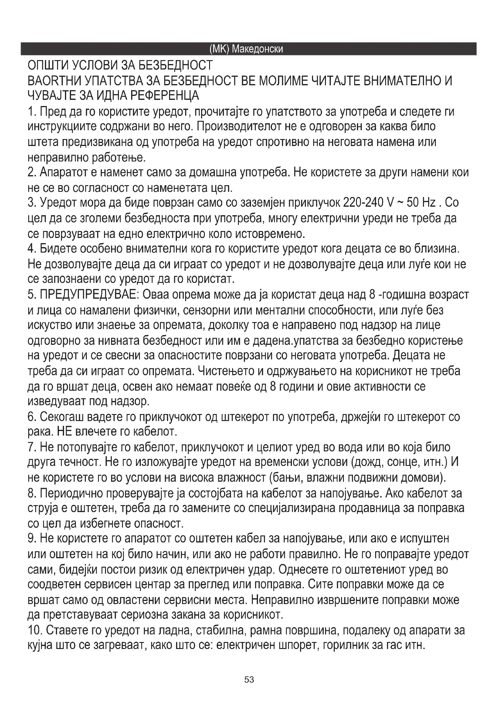 и лица со намалени физички, сензорни или ментални способности, или луѓе без искуство или знаење за опремата, доколку тоа е направено под надзор на лице одговорно за нивната безбедност или им е дадена.упатства за безбедно користење на уредот и се свесни за опасностите поврзани со неговата употреба. Децата не треба да си играат со опремата. Чистењето и одржувањето на корисникот не треба да го вршат деца, освен ако немаат повеќе од 8 години и овие активности се изведуваат под надзор.