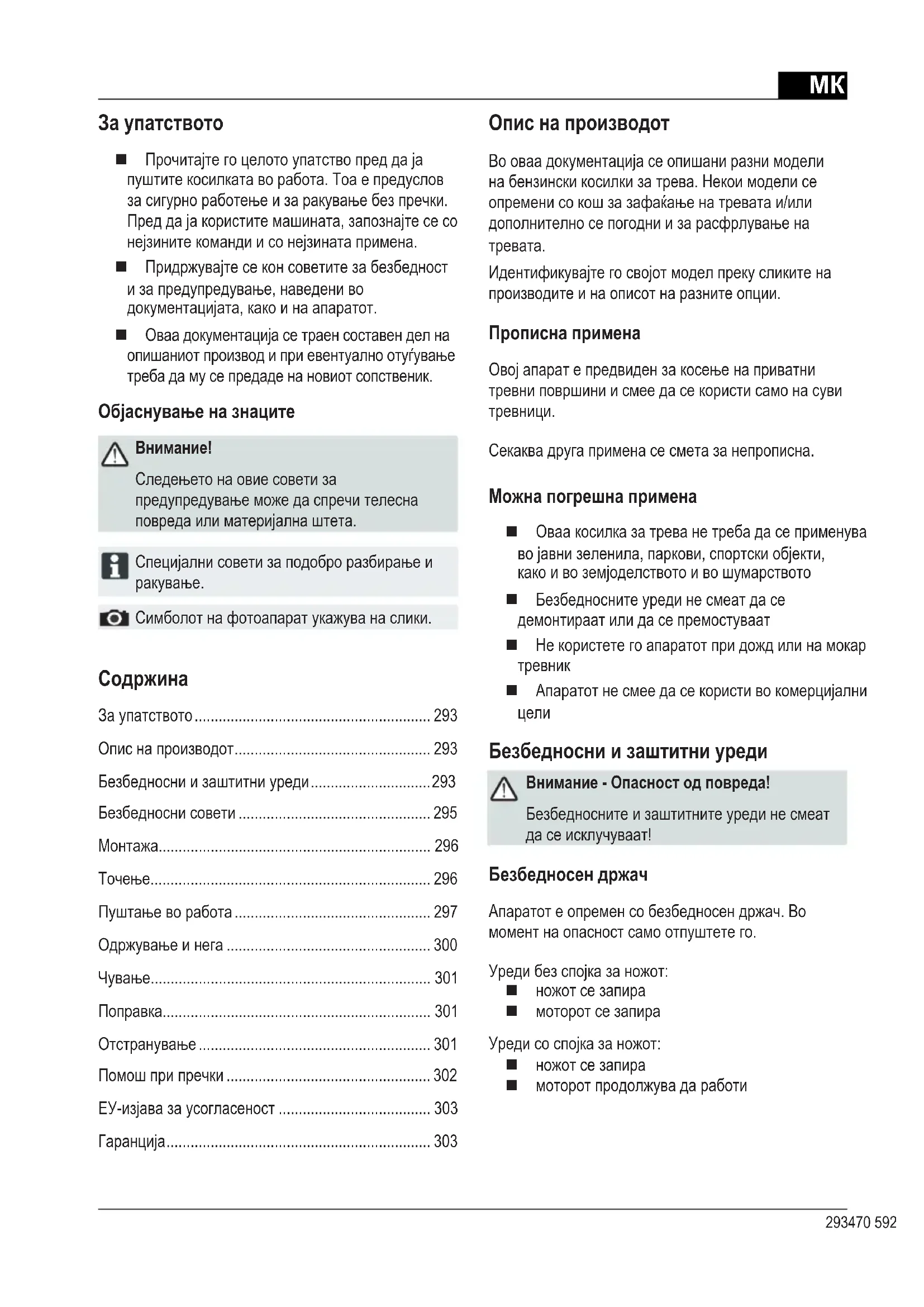 Δήλωση συμμόρφωσης ΕΚ βλ.οδηγίεςσυναρμολόγησηςМК 293470 592_f За упатството Прочитајтегоцелотоупатствопреддаја пуштитекосилкатаворабота.Тоаепредуслов засигурноработењеизаракувањебезпречки. Преддајакориститемашината,запознајтесесо нејзинитекомандиисонејзинатапримена. Придржувајтесеконсоветитезабезбедност изапредупредување,наведениво документацијата,какоинаапаратот. Оваадокументацијасетраенсоставенделна опишаниотпроизводиприевентуалноотуѓување требадамусепредаденановиотсопственик. Објаснување на знаците
