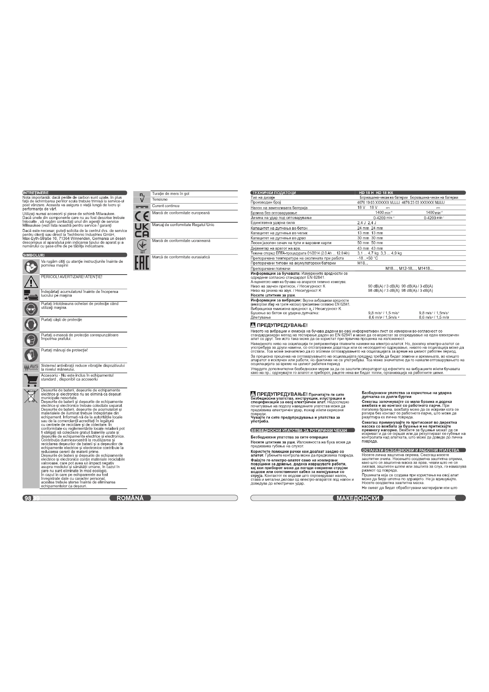 Не ги чувајте батериите заедно со метални предмети (ризик од краток спој). Користете исклучиво Систем M18 за полнење на батерии од M18 систем. Не користете батерии од друг систем. Киселината од оштетените батериите може да истече при екстремен напон или температури. Доколку дојдете во контакт со исатата, измијте се веднаш со сапун и вода. Во случај на контакт со очите плакнете ги убаво најмалку 10минути и задолжително одете на лекар. Предупредување! За да избегнете опасноста од пожар, од наранувања или од оштетување на производот, коишто ги создава краток спој, не ја потопувајте во течност алатката, заменливата батерија или полначот и пазете во уредите и во батериите да не проникнуваат течности. Корозивни или електроспроводливи течности, како солена вода, одредени хемикалии, избелувачки препарати или производи кои содржат избелувачки супстанции, можат да предизвикаат краток спој. СПЕЦИФИЦИРАНИ УСЛОВИ НА УПОТРЕБА Вртливиот пневматски чекан може да биде употребен за дупчење и дупчење во дрво, метал како и пластика при независна употреба далеку од главното напојување. Не го користете овој производ на било кој друг начин освен пропишаниот за нормална употреба. ПРЕОСТАНАТИ РИЗИЦИ Дури и при уредна употреба на машината, не може да се исклучат сите преостанати ризици. При употребата може да настанат следните опасности, на кои операторот треба особено да внимава: