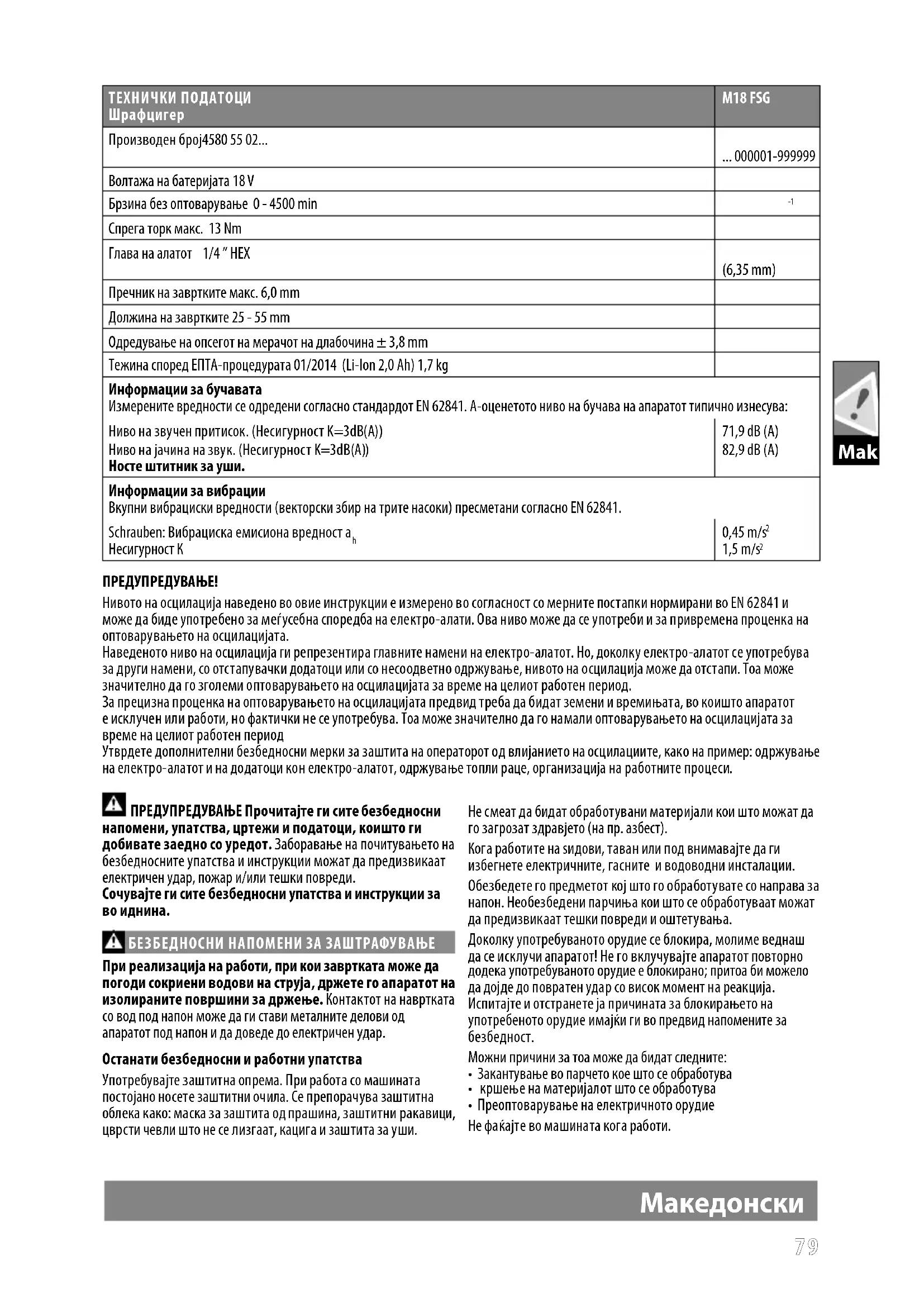 M18 FSG Производен број 4580 55 02... ... 000001-999999 Волтажа на батеријата 18 V Брзина без оптоварување 0 - 4500 min