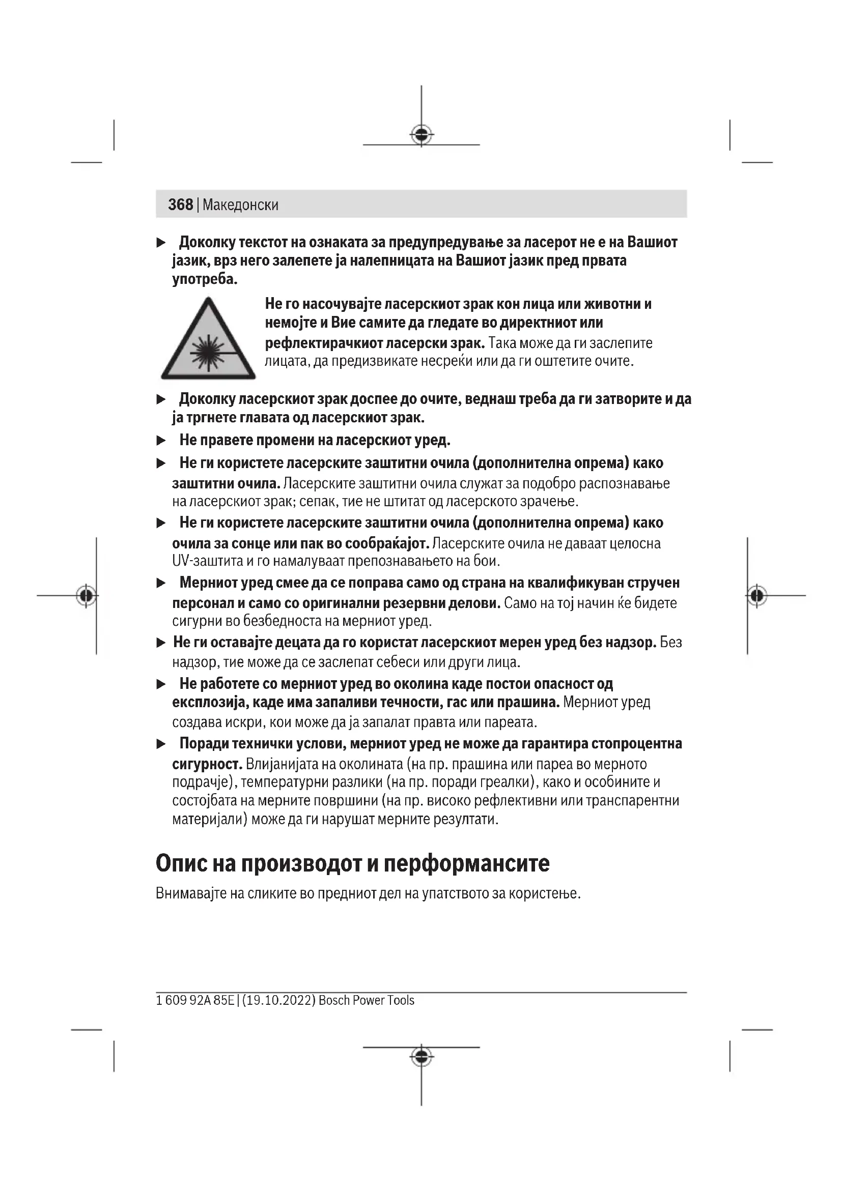 Безбедносни напомени Сите упатства треба да се прочитаат и да се внимава на нив, за да може безбедно и без опасност да работите со мерниот уред. Доколку мерниот уред не се користи согласно приложените инструкции, може да се наруши функцијата на вградените заштитни механизми во мерниот уред. Не ги оштетувајте налепниците за предупредување. ДОБРО ЧУВАЈТЕ ГИ ОВИЕ УПАТСТВА И ПРЕДАДЕТЕ ГИ ЗАЕДНО СО МЕРНИОТ УРЕД. u Внимание – доколку користите други уреди за подесување и ракување освен овде наведените или поинакви постапки, ова може да доведе до опасна изложеност на зрачење. u Мерниот уред се испорачува со ознака за предупредување за ласерот (означено на приказот на мерниот уред на графичката страна). Bosch Power Tools 1 609 92A 85E | (19.10.2022)368 | Македонски u Доколку текстот на ознаката за предупредување за ласерот не е на Вашиот јазик, врз него залепете ја налепницата на Вашиот јазик пред првата