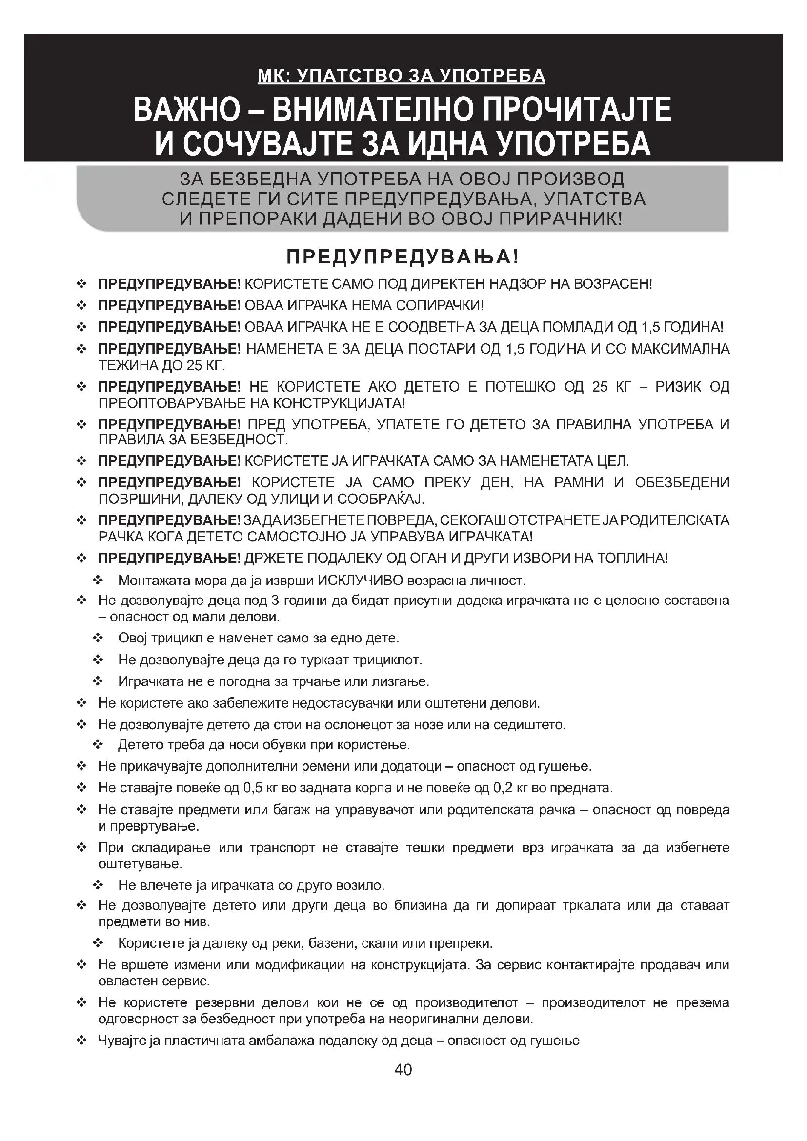 - У случају уобичајених проблема у раду обратите се овлашћеном сервисном центру. 39ЗА БЕЗБЕДНА УПОТРЕБА НА ОВОЈ ПРОИЗВОД СЛЕДЕТЕ ГИ СИТЕ ПРЕДУПРЕДУВАЊА, УПАТСТВА И ПРЕПОРАКИ ДАДЕНИ ВО ОВОЈ ПРИРАЧНИК! МК: УПАТСТВО ЗА УПОТРЕБА ВАЖНО – ВНИМАТЕЛНО ПРОЧИТАЈТЕ И СОЧУВАЈТЕ ЗА ИДНА УПОТРЕБА ПРЕДУПРЕДУВАЊА! ПРЕДУПРЕДУВАЊЕ! КОРИСТЕТЕ САМО ПОД ДИРЕКТЕН НАДЗОР НА ВОЗРАСЕН! ПРЕДУПРЕДУВАЊЕ! ОВАА ИГРАЧКА НЕМА СОПИРАЧКИ! ПРЕДУПРЕДУВАЊЕ! ОВАА ИГРАЧКА НЕ Е СООДВЕТНА ЗА ДЕЦА ПОМЛАДИ ОД 1,5 ГОДИНА! ПРЕДУПРЕДУВАЊЕ! НАМЕНЕТА Е ЗА ДЕЦА ПОСТАРИ ОД 1,5 ГОДИНА И СО МАКСИМАЛНА ТЕЖИНА ДО 25 КГ. ПРЕДУПРЕДУВАЊЕ! НЕ КОРИСТЕТЕ АКО ДЕТЕТО Е ПОТЕШКО ОД 25 КГ – РИЗИК ОД ПРЕОПТОВАРУВАЊЕ НА КОНСТРУКЦИЈАТА! ПРЕДУПРЕДУВАЊЕ! ПРЕД УПОТРЕБА, УПАТЕТЕ ГО ДЕТЕТО ЗА ПРАВИЛНА УПОТРЕБА И ПРАВИЛА ЗА БЕЗБЕДНОСТ. ПРЕДУПРЕДУВАЊЕ! КОРИСТЕТЕ ЈА ИГРАЧКАТА САМО ЗА НАМЕНЕТАТА ЦЕЛ. ПРЕДУПРЕДУВАЊЕ! КОРИСТЕТЕ ЈА САМО ПРЕКУ ДЕН, НА РАМНИ И ОБЕЗБЕДЕНИ ПОВРШИНИ, ДАЛЕКУ ОД УЛИЦИ И СООБРАЌАЈ. ПРЕДУПРЕДУВАЊЕ! ЗА ДА ИЗБЕГНЕТЕ ПОВРЕДА, СЕКОГАШ ОТСТРАНЕТЕ ЈА РОДИТЕЛСКАТА РАЧКА КОГА ДЕТЕТО САМОСТОЈНО ЈА УПРАВУВА ИГРАЧКАТА! ПРЕДУПРЕДУВАЊЕ! ДРЖЕТЕ ПОДАЛЕКУ ОД ОГАН И ДРУГИ ИЗВОРИ НА ТОПЛИНА! Монтажата мора да ја изврши ИСКЛУЧИВО возрасна личност. Не дозволувајте деца под 3 години да бидат присутни додека играчката не е целосно составена – опасност од мали делови. Овој трицикл е наменет само за едно дете. Не дозволувајте деца да го туркаат трициклот. Играчката не е погодна за трчање или лизгање. Не користете ако забележите недостасувачки или оштетени делови. Не дозволувајте детето да стои на ослонецот за нозе или на седиштето. Детето треба да носи обувки при користење. Не прикачувајте дополнителни ремени или додатоци – опасност од гушење. Не ставајте повеќе од 0,5 кг во задната корпа и не повеќе од 0,2 кг во предната. Не ставајте предмети или багаж на управувачот или родителската рачка – опасност од повреда и превртување. При складирање или транспорт не ставајте тешки предмети врз играчката за да избегнете оштетување. Не влечете ја играчката со друго возило. Не дозволувајте детето или други деца во близина да ги допираат тркалата или да ставаат предмети во нив. Користете ја далеку од реки, базени, скали или препреки. Не вршете измени или модификации на конструкцијата. За сервис контактирајте продавач или овластен сервис. Не користете резервни делови кои не се од производителот – производителот не презема одговорност за безбедност при употреба на неоригинални делови. Чувајте ја пластичната амбалажа подалеку од деца – опасност од гушење 40КАРАКТЕРИСТИКИ НА ПРОИЗВОДОТ Играчката е соодветна за деца постари од 1,5 година и со тежина до 25 кг. Ова е функционална играчка наменета за развивање на почетните вештини на вашето дете за ракување и координација на движењата на рацете и нозете при самостојно возење трицикл или