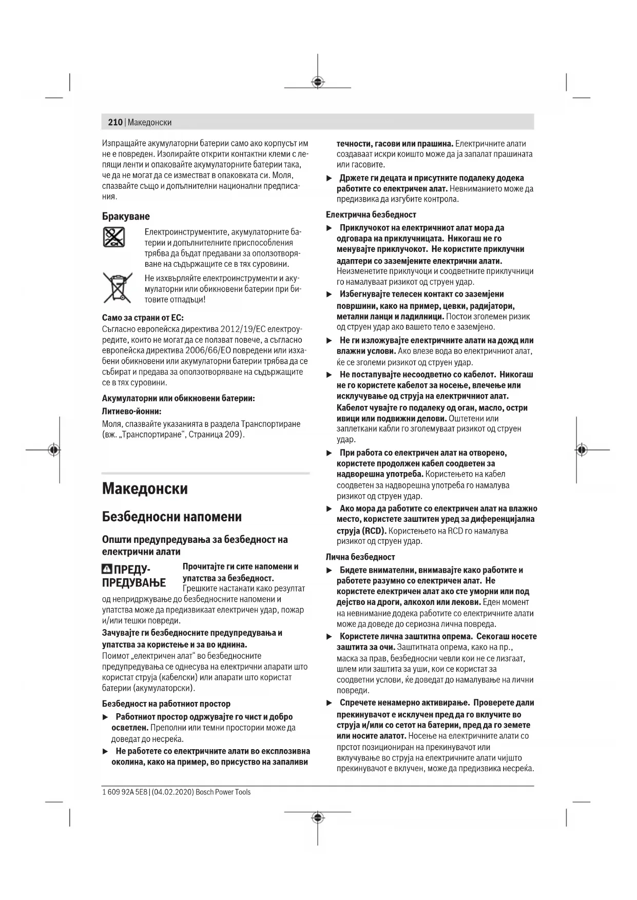 Литиум-јонските батерии подлежат на барањата на Законот за опасни материјали. Батериите може да се транспортираат само од страна на корисникот, без потреба од дополнителни квалификации. При пренос на истите од страна на трети лица (на пр. воздушен транспорт или шпедиција) неопходно е да се внимава на специјалните напомени на амбалажата и ознаките. Во таков случај, при подготовката на пратката мора да се повика експерт за опасни супстанци. Транспортирајте ги батериите само доколку куќиштето е неоштетено. Залепете ги отворените контакти и спакувајте ја батеријата на тој начин што нема да се движи во амбалажата. Ве молиме внимавајте на евентуалните дополнителни национални прописи. Отстранување Електричните апарати, батериите, опремата и амбалажите треба да се отстранат на еколошки прифатлив начин. Не ги фрлајте електричните апарати и батериите во домашната канта за ѓубре! Само за земјите од ЕУ: Според европската регулатива 2012/19/EU електричните апарати што се вон употреба и дефектните или искористените батерии според регулативата 2006/66/EC мора одделно да се соберат и да се рециклираат за повторна употреба. Bosch Power Tools 1 609 92A 5E8 | (04.02.2020)220 | Srpski