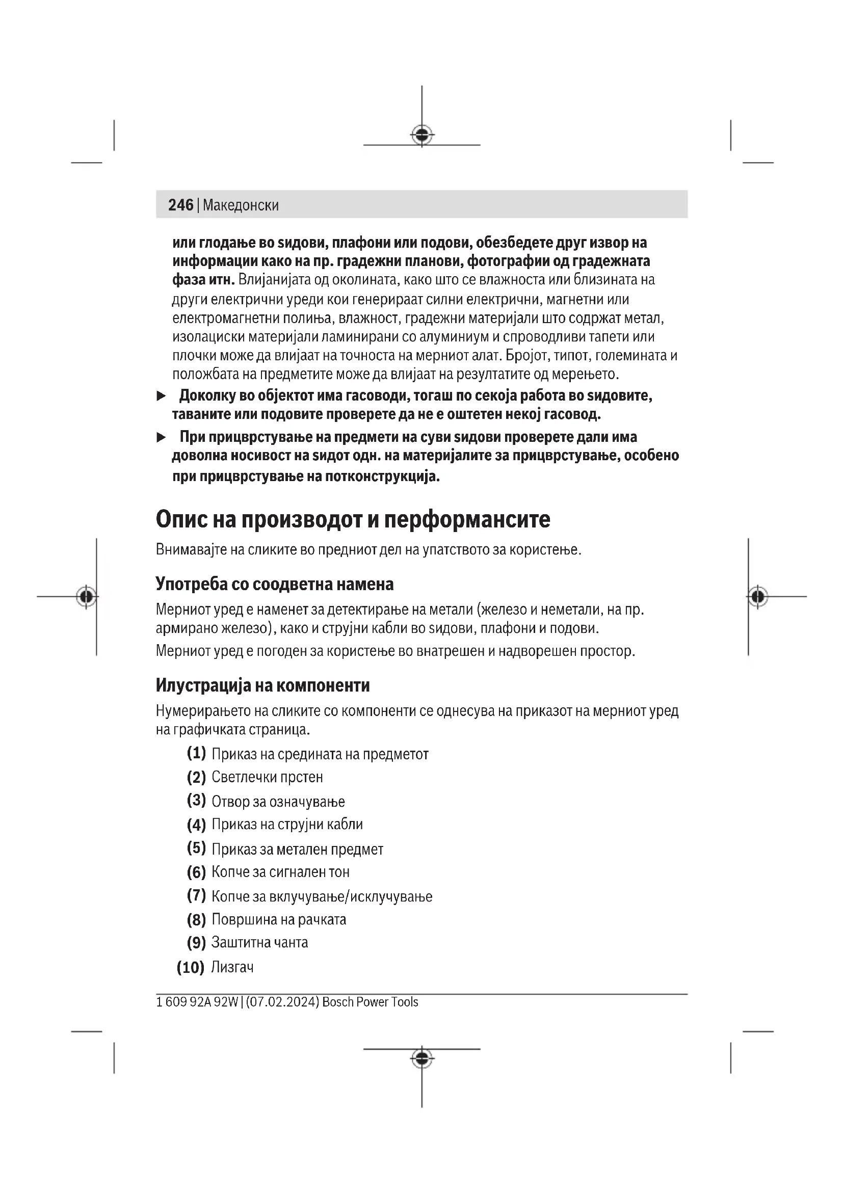 Безбедносни напомени Сите упатства треба да се прочитаат и да се внимава на нив. Доколку мерниот уред не се користи согласно приложените инструкции, може да се наруши функцијата на вградените заштитни механизми во мерниот уред. ДОБРО ЧУВАЈТЕ ГИ ОВИЕ УПАТСТВА. u Мерниот уред смее да се поправа само од страна на квалификуван стручен персонал и само со оригинални резервни делови. Само на тој начин ќе бидете сигурни во безбедноста на мерниот уред. u Не работете со мерниот уред во околина каде постои опасност од експлозија, каде има запаливи течности, гас или прашина. Мерниот уред создава искри, кои може да ја запалат правта или пареата. u Поради технички услови, мерниот уред не може да гарантира стопроцентна сигурност. За да избегнете опасности, пред секое дупчење, сечење со пила Bosch Power Tools 1 609 92A 92W | (07.02.2024)246 | Македонски или глодање во ѕидови, плафони или подови, обезбедете друг извор на информации како на пр. градежни планови, фотографии од градежната фаза итн. Влијанијата од околината, како што се влажноста или близината на други електрични уреди кои генерираат силни електрични, магнетни или електромагнетни полиња, влажност, градежни материјали што содржат метал, изолациски материјали ламинирани со алуминиум и спроводливи тапети или плочки може да влијаат на точноста на мерниот алат. Бројот, типот, големината и положбата на предметите може да влијаат на резултатите од мерењето. u Доколку во објектот има гасоводи, тогаш по секоја работа во ѕидовите, таваните или подовите проверете да не е оштетен некој гасовод. u При прицврстување на предмети на суви ѕидови проверете дали има доволна носивост на ѕидот одн. на материјалите за прицврстување, особено при прицврстување на потконструкција. Опис на производот и перформансите Внимавајте на сликите во предниот дел на упатството за користење. Употреба со соодветна намена Мерниот уред е наменет за детектирање на метали (железо и неметали, на пр. армирано железо), како и струјни кабли во ѕидови, плафони и подови. Мерниот уред е погоден за користење во внатрешен и надворешен простор. Илустрација на компоненти Нумерирањето на сликите со компоненти се однесува на приказот на мерниот уред на графичката страница. (1) Приказ на средината на предметот (2) Светлечки прстен (3) Отвор за означување (4) Приказ на струјни кабли (5) Приказ за метален предмет (6) Копче за сигнален тон (7) Копче за вклучување/исклучување (8) Површина на рачката (9) Заштитна чанта (10)