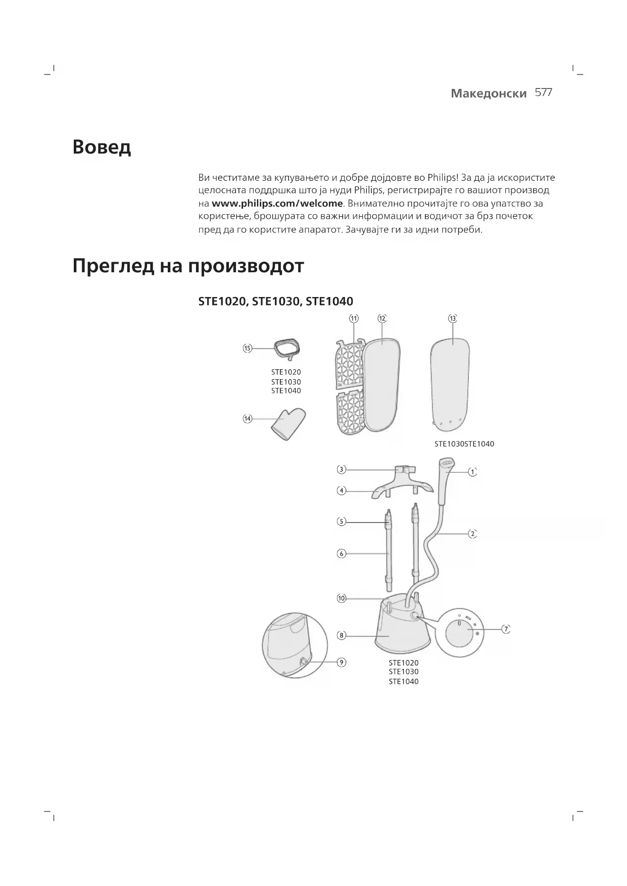 1 Глава на апаратот за пареа 2 Црево за довод на пареа 3 Држач за апарат за пареа 4 Закачалка (STE1011, STE1020, STE1030, STE1040) 5 Штипка за блокирање на држачите 6 Држач 7 Регулатор за пареа 8 Основа 9 Регулатор за отстранување бигор 10 Резервоар за вода579